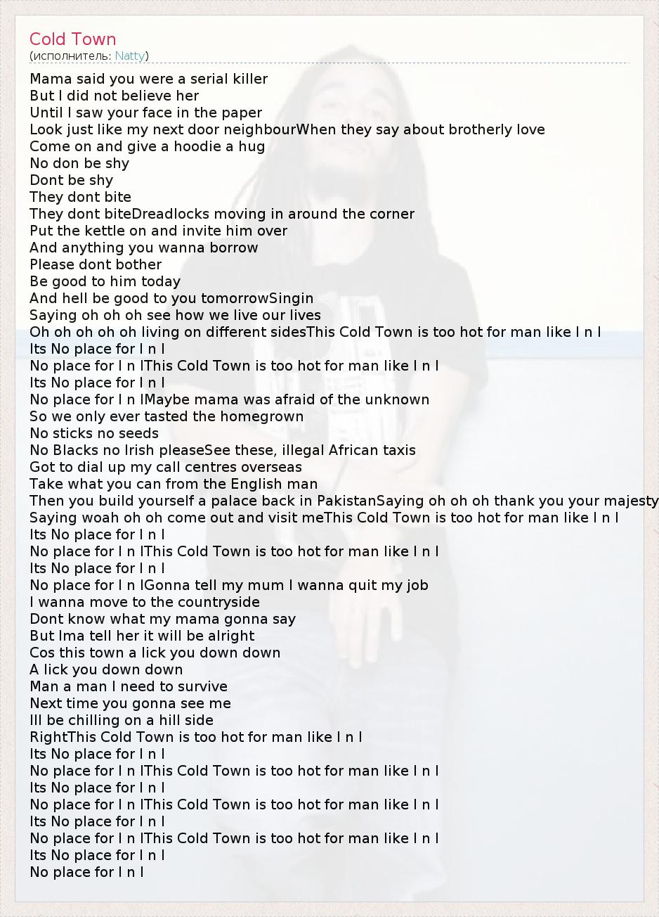 Mama said you were a serial killer But I did not believe her Until I saw your face in the paper Look just like my next door neighbourWhen they say about brotherly love Come on and give a hoodie a hug No don be shy Dont be shy They dont bite They dont biteDreadlocks moving in around the corner Put the kettle on and invite him over And anything you wanna borrow Please dont bother Be good to him today And hell be good to you tomorrowSingin Saying oh oh oh see how we live our lives Oh oh oh oh oh living on different sidesThis Cold Town is too hot for man like I n I Its No place for I n I No place for I n IThis Cold Town is too hot for man like I n I Its No place for I n I No place for I n IMaybe mama was afraid of the unknown So we only ever tasted the homegrown No sticks no seeds No Blacks no Irish pleaseSee these, illegal African taxis Got to dial up my call centres overseas Take what you can from the English man Then you build yourself a palace back in PakistanSaying oh oh oh thank you your majesty Saying woah oh oh come out and visit meThis Cold Town is too hot for man like I n I Its No place for I n I No place for I n IThis Cold Town is too hot for man like I n I Its No place for I n I No place for I n IGonna tell my mum I wanna quit my job I wanna move to the countryside Dont know what my mama gonna say But Ima tell her it will be alright Cos this town a lick you down down A lick you down down Man a man I need to survive Next time you gonna see me Ill be chilling on a hill side RightThis Cold Town is too hot for man like I n I Its No place for I n I No place for I n IThis Cold Town is too hot for man like I n I Its No place for I n I No place for I n IThis Cold Town is too hot for man like I n I Its No place for I n I No place for I n IThis Cold Town is too hot for man like I n I Its No place for I n I No place for I n I