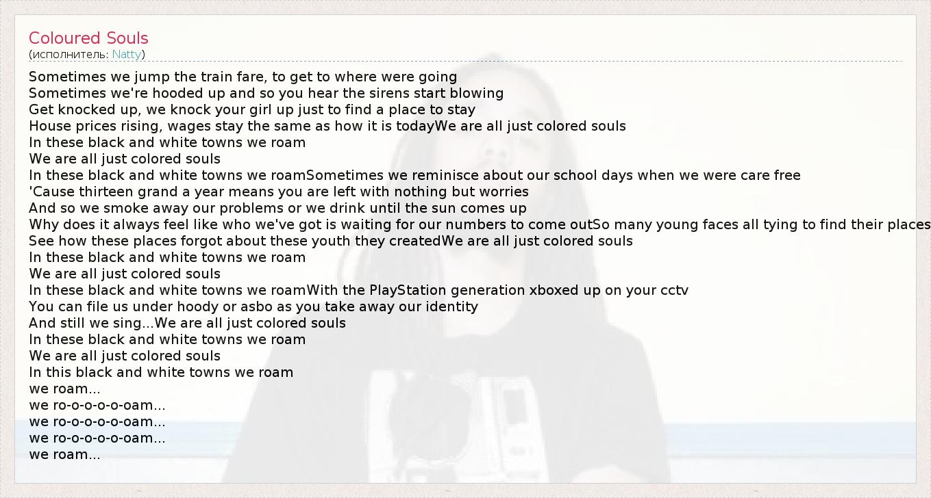 Sometimes we jump the train fare, to get to where were going Sometimes we're hooded up and so you hear the sirens start blowing Get knocked up, we knock your girl up just to find a place to stay House prices rising, wages stay the same as how it is todayWe are all just colored souls In these black and white towns we roam We are all just colored souls In these black and white towns we roamSometimes we reminisce about our school days when we were care free 'Cause thirteen grand a year means you are left with nothing but worries And so we smoke away our problems or we drink until the sun comes up Why does it always feel like who we've got is waiting for our numbers to come outSo many young faces all tying to find their places See how these places forgot about these youth they createdWe are all just colored souls In these black and white towns we roam We are all just colored souls In these black and white towns we roamWith the PlayStation generation xboxed up on your cctv You can file us under hoody or asbo as you take away our identity And still we sing...We are all just colored souls In these black and white towns we roam We are all just colored souls In this black and white towns we roam we roam... we ro-o-o-o-o-oam... we ro-o-o-o-o-oam... we ro-o-o-o-o-oam... we roam...