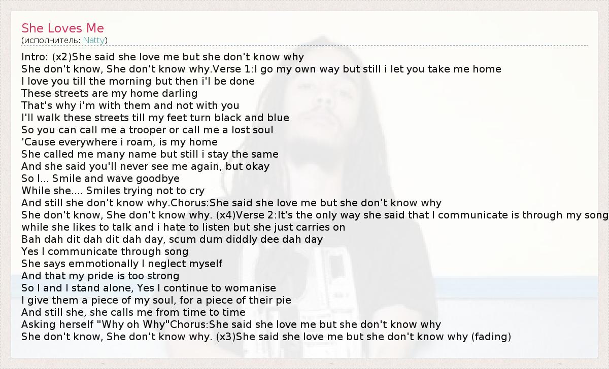 Intro: (x2)She said she love me but she don't know why She don't know, She don't know why.Verse 1:I go my own way but still i let you take me home I love you till the morning but then i'l be done These streets are my home darling That's why i'm with them and not with you I'll walk these streets till my feet turn black and blue So you can call me a trooper or call me a lost soul 'Cause everywhere i roam, is my home She called me many name but still i stay the same And she said you'll never see me again, but okay So I... Smile and wave goodbye While she.... Smiles trying not to cry And still she don't know why.Chorus:She said she love me but she don't know why She don't know, She don't know why. (x4)Verse 2:It's the only way she said that I communicate is through my song while she likes to talk and i hate to listen but she just carries on Bah dah dit dah dit dah day, scum dum diddly dee dah day Yes I communicate through song She says emmotionally I neglect myself And that my pride is too strong So I and I stand alone, Yes I continue to womanise I give them a piece of my soul, for a piece of their pie And still she, she calls me from time to time Asking herself "Why oh Why"Chorus:She said she love me but she don't know why She don't know, She don't know why. (x3)She said she love me but she don't know why (fading)