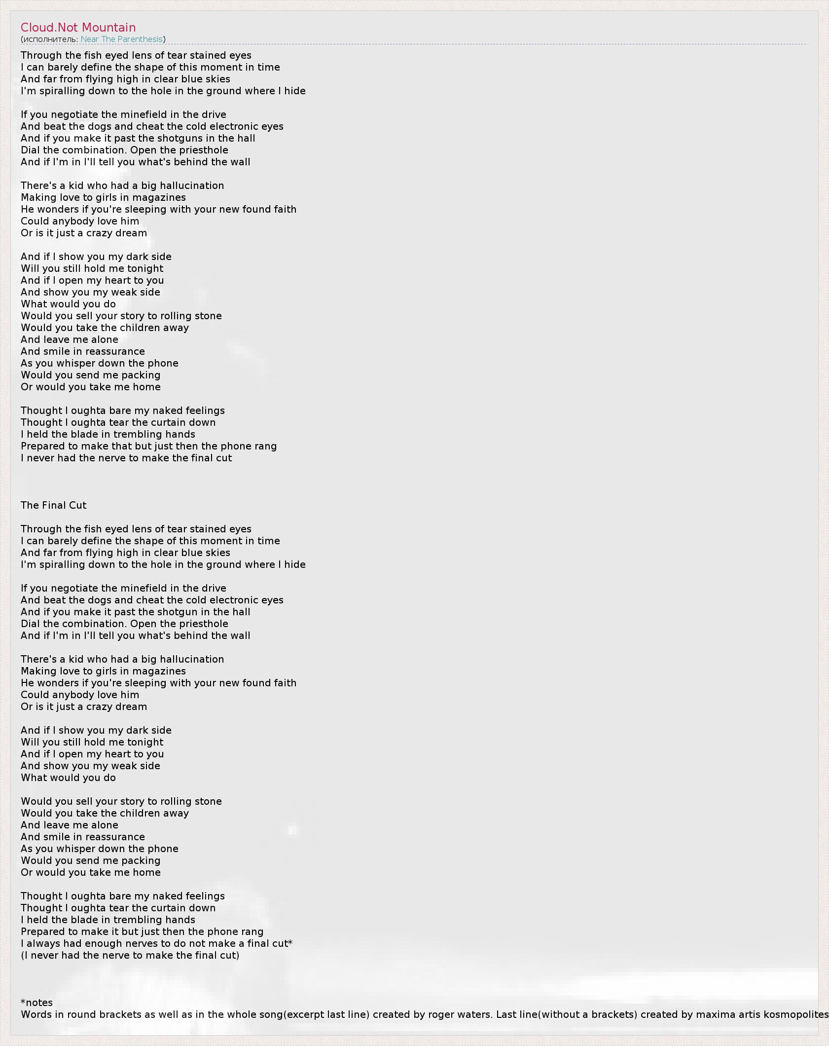 Сквозь рыбоглазые линзы заплаканных глаз, Я едва ли могу определить очертания этого момента времени. И удаляясь от вышины чистых голубых небес, Я вхожу в пике в направлении норы в земле, и в ней скрываюсь. Если ты пройдешь минное поле, Справишься с собаками и обманешь холодные электронные глаза, И если ты минуешь дробовики в прихожей, Набери комбинацию. Открой окошко священника. И если я там, я поведаю тебе о том... (что находится за стеной) Вот ребёнок у которого была сильная галлюцинация. Занимаясь любовью с девчонками из журналов, Он интересуется: если кто-либо спит со своей вновь обретённой верой, Может ли кто-нибудь полюбить его, Или это только безумная мечта? И если я покажу тебе свою тёмную сторону, Будешь ли ты продолжать удерживать меня? И если я открою тебе своё сердце, И покажу свои слабые стороны, Что ты будешь делать? Продашь свою историю в журнал "Роллинг Стоун"? Заберёшь детей, И оставишь меня одного? И улыбнешься в успокоении, Шепча в телефон. Пришлешь мне вещи Или отведешь меня домой? Я думал, что готов раздеть свои голые чувства. Я думал, что готов сорвать занавес. Я держал лезвие дрожащими руками, Готовый сделать это, но именно тогда зазвонил телефон. У меня никогда не было характера, чтобы поставить последнюю точку. Финальный надрез (перевод Максим Найденко из Таганрога) Cквозь рыбообразные линзы, застеленных пеленой слез глаз, C трудом улавливаю очертания этого мгновенья во времени. И отнюдь не порхая в чистом небе, напротив, Пикирую вниз в земной лаз, где я прячусь от бремени. Если обойдешь минное поле, что стоит на пути, И свору собак, обнажишь и электронный глаз впереди, Пройдешь по предтечею с винтовкой в руке, Справишься с сейфом в столе, И, если найдешь меня там - открою правду о том, кто прячется в стене. Там паренек, что словно грезит на яву, И женщины с обложек улыбаются ему. Ему нужно знать, не станешь ты ли хоть во сне его судьбой, Любили ли его, Или все это был безумца сон. И если открою свою темную сторону, Обнимешь ли ночью еще. И если открою я сердце свое, Покажу слабину, Что сделаешь ты? Отдашь ли сей сказ в журнал модный, Спрячешь детей от меня, И оставишь меня одного с пометкой “негодный”, Улыбаясь, вторя горю моему Подобно шепоту по телефону своему, Отправишь паковаться Или впустишь за порог. Обязанным считал некрытых чувств не укрывать. Обязанным считал покров сорвать. И лезвие схватив дрожащими руками, Собрался сделать это, но телефон звонит…. Смог я найти в себе завет и не покинуть этот свет* (Не смог найти я сил надрез последний совершить). *Примечания: Строчка в финале принадлежит, как в переводе, так и в оригинале автору перевода и ковер версии Максиме Артису Космополитесу, так же известному как Максиму Васильевичу Найденко. Строка из скобок в оригинале и остальной текст принадлежат автору оригинала песни(Роджеру Вотерсу).