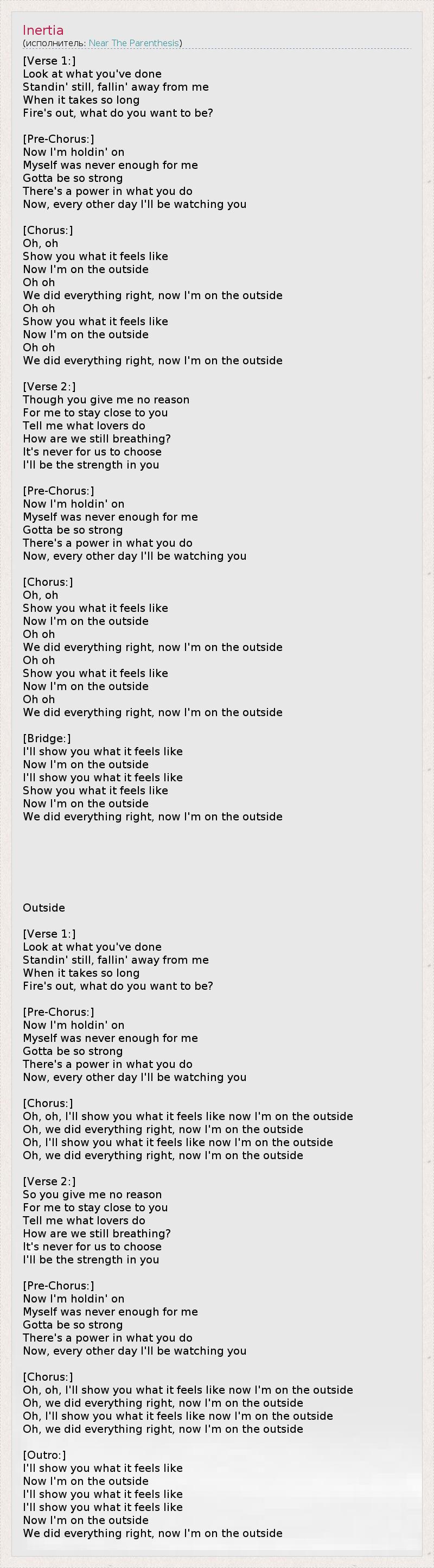 [Verse 1:] Look at what you've done Standin' still, fallin' away from me When it takes so long Fire's out, what do you want to be? [Pre-Chorus:] Now I'm holdin' on Myself was never enough for me Gotta be so strong There's a power in what you do Now, every other day I'll be watching you [Chorus:] Oh, oh Show you what it feels like Now I'm on the outside Oh oh We did everything right, now I'm on the outside Oh oh Show you what it feels like Now I'm on the outside Oh oh We did everything right, now I'm on the outside [Verse 2:] Though you give me no reason For me to stay close to you Tell me what lovers do How are we still breathing? It's never for us to choose I'll be the strength in you [Pre-Chorus:] Now I'm holdin' on Myself was never enough for me Gotta be so strong There's a power in what you do Now, every other day I'll be watching you [Chorus:] Oh, oh Show you what it feels like Now I'm on the outside Oh oh We did everything right, now I'm on the outside Oh oh Show you what it feels like Now I'm on the outside Oh oh We did everything right, now I'm on the outside [Bridge:] I'll show you what it feels like Now I'm on the outside I'll show you what it feels like Show you what it feels like Now I'm on the outside We did everything right, now I'm on the outside Outside [Verse 1:] Look at what you've done Standin' still, fallin' away from me When it takes so long Fire's out, what do you want to be? [Pre-Chorus:] Now I'm holdin' on Myself was never enough for me Gotta be so strong There's a power in what you do Now, every other day I'll be watching you [Chorus:] Oh, oh, I'll show you what it feels like now I'm on the outside Oh, we did everything right, now I'm on the outside Oh, I'll show you what it feels like now I'm on the outside Oh, we did everything right, now I'm on the outside [Verse 2:] So you give me no reason For me to stay close to you Tell me what lovers do How are we still breathing? It's never for us to choose I'll be the strength in you [Pre-Chorus:] Now I'm holdin' on Myself was never enough for me Gotta be so strong There's a power in what you do Now, every other day I'll be watching you [Chorus:] Oh, oh, I'll show you what it feels like now I'm on the outside Oh, we did everything right, now I'm on the outside Oh, I'll show you what it feels like now I'm on the outside Oh, we did everything right, now I'm on the outside [Outro:] I'll show you what it feels like Now I'm on the outside I'll show you what it feels like I'll show you what it feels like Now I'm on the outside We did everything right, now I'm on the outside