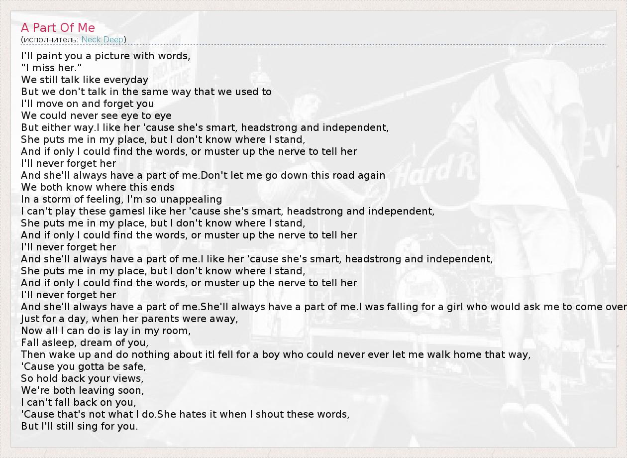 I'll paint you a picture with words, "I miss her." We still talk like everyday But we don't talk in the same way that we used to I'll move on and forget you We could never see eye to eye But either way.I like her 'cause she's smart, headstrong and independent, She puts me in my place, but I don't know where I stand, And if only I could find the words, or muster up the nerve to tell her I'll never forget her And she'll always have a part of me.Don't let me go down this road again We both know where this ends In a storm of feeling, I'm so unappealing I can't play these gamesI like her 'cause she's smart, headstrong and independent, She puts me in my place, but I don't know where I stand, And if only I could find the words, or muster up the nerve to tell her I'll never forget her And she'll always have a part of me.I like her 'cause she's smart, headstrong and independent, She puts me in my place, but I don't know where I stand, And if only I could find the words, or muster up the nerve to tell her I'll never forget her And she'll always have a part of me.She'll always have a part of me.I was falling for a girl who would ask me to come over Just for a day, when her parents were away, Now all I can do is lay in my room, Fall asleep, dream of you, Then wake up and do nothing about itI fell for a boy who could never ever let me walk home that way, 'Cause you gotta be safe, So hold back your views, We're both leaving soon, I can't fall back on you, 'Cause that's not what I do.She hates it when I shout these words, But I'll still sing for you.