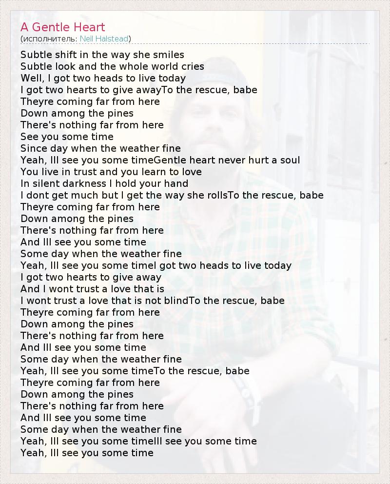 Subtle shift in the way she smiles Subtle look and the whole world cries Well, I got two heads to live today I got two hearts to give awayTo the rescue, babe Theyre coming far from here Down among the pines There's nothing far from here See you some time Since day when the weather fine Yeah, Ill see you some timeGentle heart never hurt a soul You live in trust and you learn to love In silent darkness I hold your hand I dont get much but I get the way she rollsTo the rescue, babe Theyre coming far from here Down among the pines There's nothing far from here And Ill see you some time Some day when the weather fine Yeah, Ill see you some timeI got two heads to live today I got two hearts to give away And I wont trust a love that is I wont trust a love that is not blindTo the rescue, babe Theyre coming far from here Down among the pines There's nothing far from here And Ill see you some time Some day when the weather fine Yeah, Ill see you some timeTo the rescue, babe Theyre coming far from here Down among the pines There's nothing far from here And Ill see you some time Some day when the weather fine Yeah, Ill see you some timeIll see you some time Yeah, Ill see you some time
