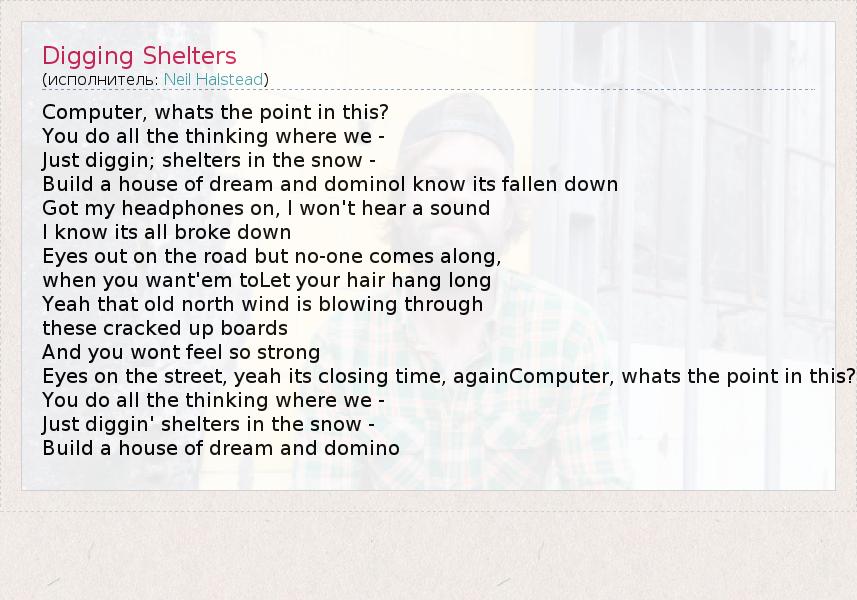 Computer, whats the point in this? You do all the thinking where we - Just diggin; shelters in the snow - Build a house of dream and dominoI know its fallen down Got my headphones on, I won't hear a sound I know its all broke down Eyes out on the road but no-one comes along, when you want'em toLet your hair hang long Yeah that old north wind is blowing through these cracked up boards And you wont feel so strong Eyes on the street, yeah its closing time, againComputer, whats the point in this? You do all the thinking where we - Just diggin' shelters in the snow - Build a house of dream and domino