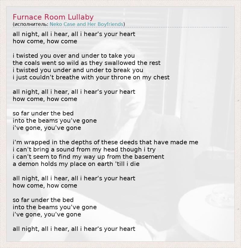 all night, all i hear, all i hear's your heart how come, how come i twisted you over and under to take you the coals went so wild as they swallowed the rest i twisted you under and under to break you i just couldn't breathe with your throne on my chest all night, all i hear, all i hear's your heart how come, how come so far under the bed into the beams you've gone i've gone, you've gone i'm wrapped in the depths of these deeds that have made me i can't bring a sound from my head though i try i can't seem to find my way up from the basement a demon holds my place on earth 'till i die all night, all i hear, all i hear's your heart how come, how come so far under the bed into the beams you've gone i've gone, you've gone all night, all i hear, all i hear's your heart