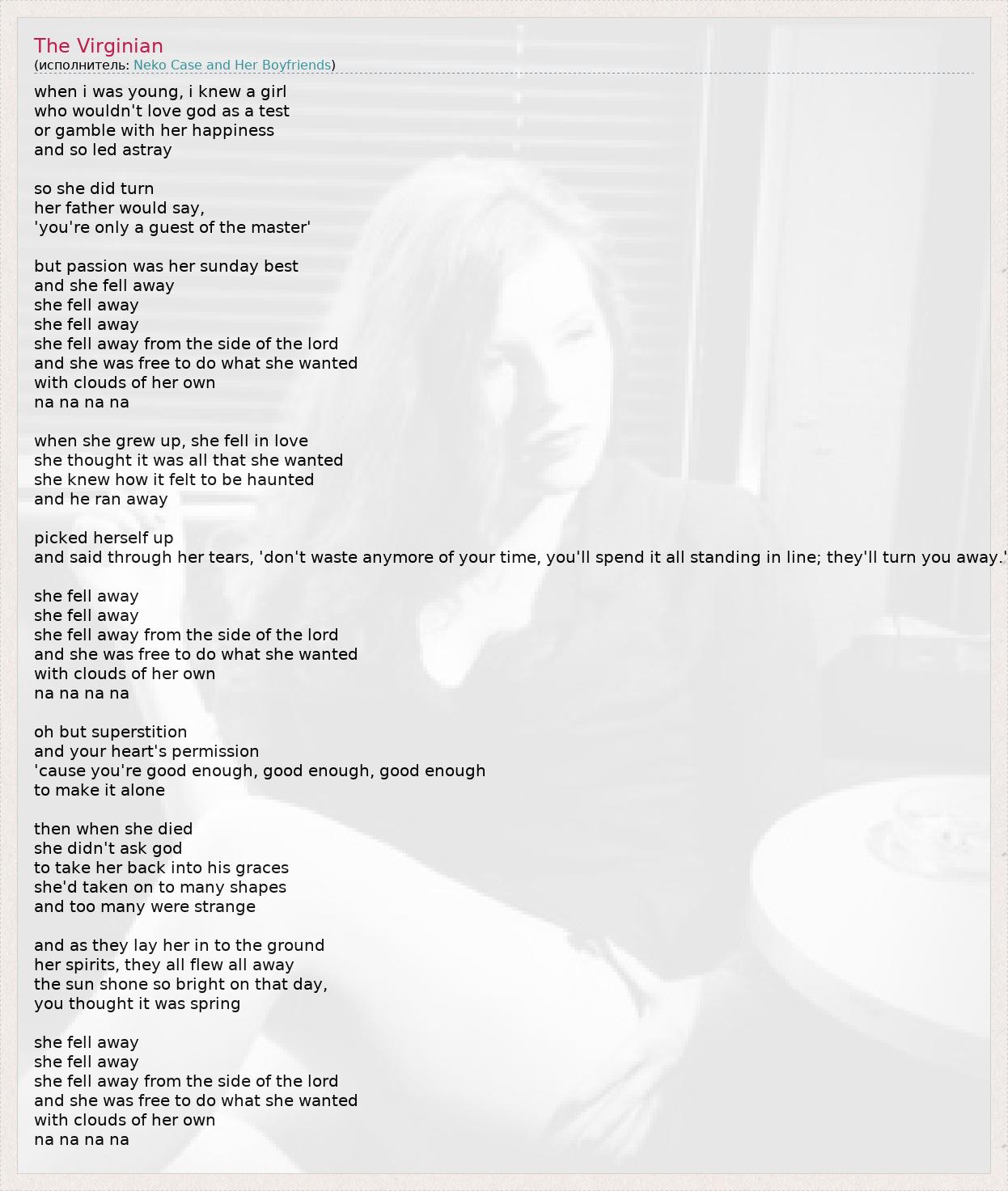 Это интересно:Neko Case is an American singer-songwriter, best known for her solo career and her contributions as a member of the Canadian indie rock group The New Pornographers.Case was born in Alexandria, Virginia, to teenage parents of Ukrainian ancestry. The original family name, changed before she was born, was Shevchenko. Her family traveled around while she was young before settling in Tacoma, Washington, the city she considers her hometown. She left home when she was fifteen. Her father was in the United States Air Force.
