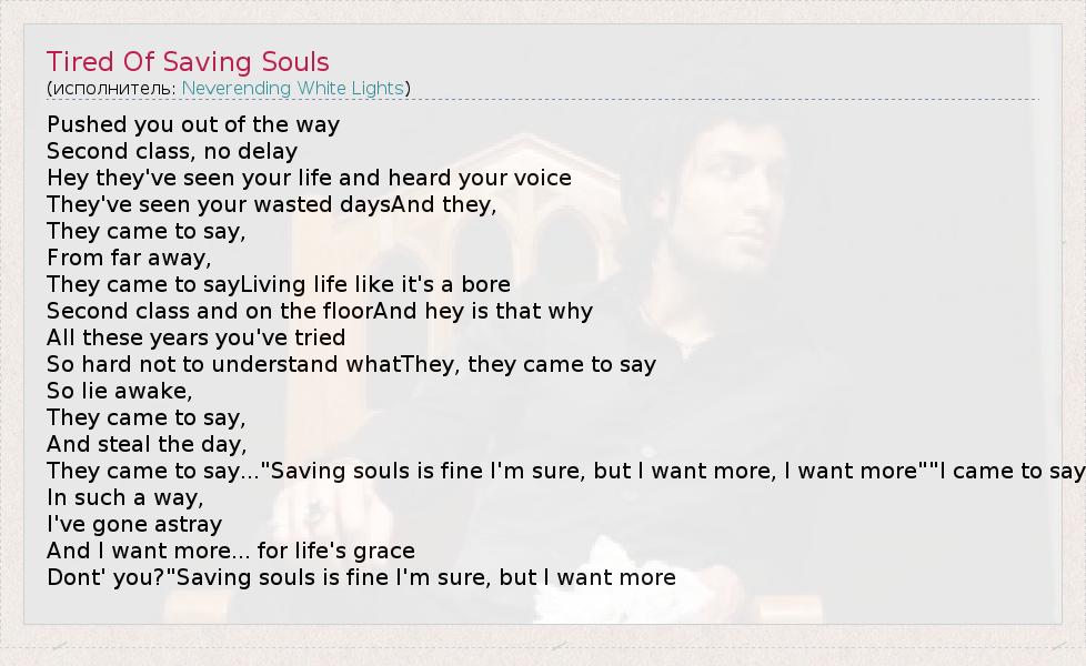А как ты думаешь, о чем песня "Tired Of Saving Souls" ?