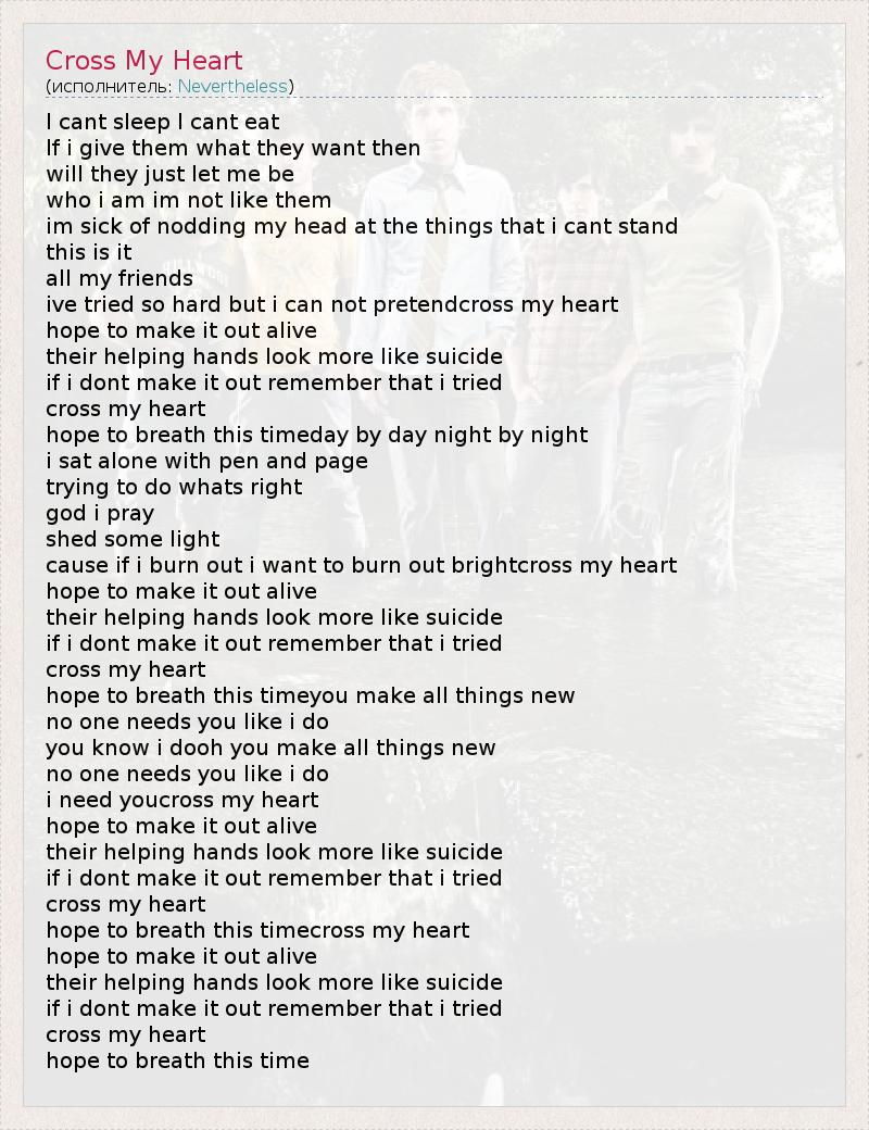 I cant sleep I cant eat If i give them what they want then will they just let me be who i am im not like them im sick of nodding my head at the things that i cant stand this is it all my friends ive tried so hard but i can not pretendcross my heart hope to make it out alive their helping hands look more like suicide if i dont make it out remember that i tried cross my heart hope to breath this timeday by day night by night i sat alone with pen and page trying to do whats right god i pray shed some light cause if i burn out i want to burn out brightcross my heart hope to make it out alive their helping hands look more like suicide if i dont make it out remember that i tried cross my heart hope to breath this timeyou make all things new no one needs you like i do you know i dooh you make all things new no one needs you like i do i need youcross my heart hope to make it out alive their helping hands look more like suicide if i dont make it out remember that i tried cross my heart hope to breath this timecross my heart hope to make it out alive their helping hands look more like suicide if i dont make it out remember that i tried cross my heart hope to breath this time