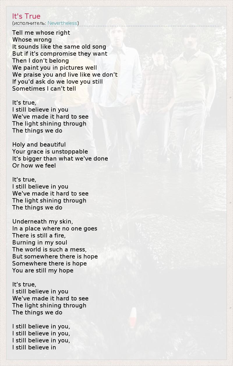 Tell me whose right Whose wrong It sounds like the same old song But if it's compromise they want Then I don't belong We paint you in pictures well We praise you and live like we don't If you'd ask do we love you still Sometimes I can't tell It's true, I still believe in you We've made it hard to see The light shining through The things we do Holy and beautiful Your grace is unstoppable It's bigger than what we've done Or how we feel It's true, I still believe in you We've made it hard to see The light shining through The things we do Underneath my skin, In a place where no one goes There is still a fire, Burning in my soul The world is such a mess, But somewhere there is hope Somewhere there is hope You are still my hope It's true, I still believe in you We've made it hard to see The light shining through The things we do I still believe in you, I still believe in you, I still believe in you, I still believe in