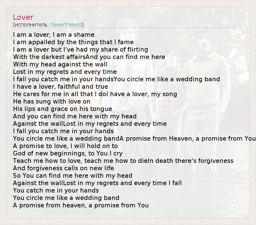 Это интересно:Nevertheless (сокращенно NTL) - christian группа из Тенесси. Название было взято из Евангелия от Луки: "Симон сказал Ему в ответ: Наставник! мы трудились всю ночь и ничего не поймали, но по слову Твоему (Nevertheless) закину сеть." Песни "Live Like We're Alive", "The Real" и "Cross... продолжение