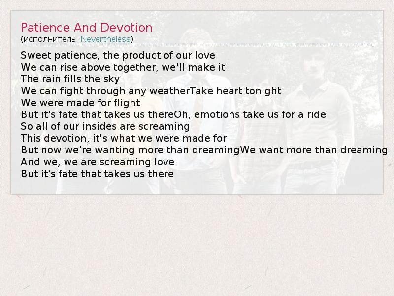 А как ты думаешь, о чем песня "Patience And Devotion" ?