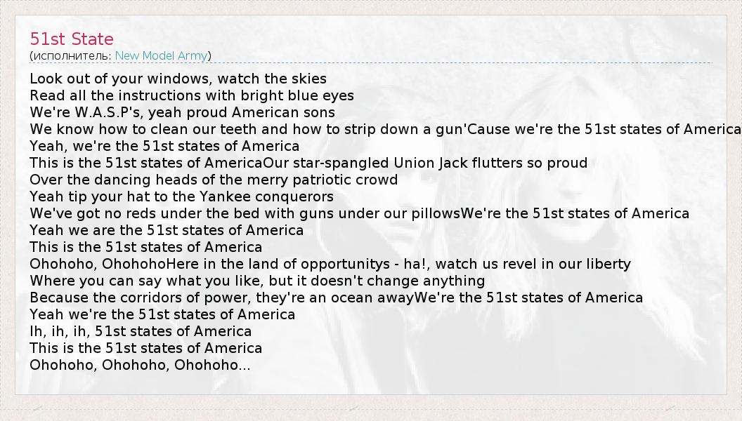 We've got no reds under the bed with guns under our pillowsWe're the 51st states of America
