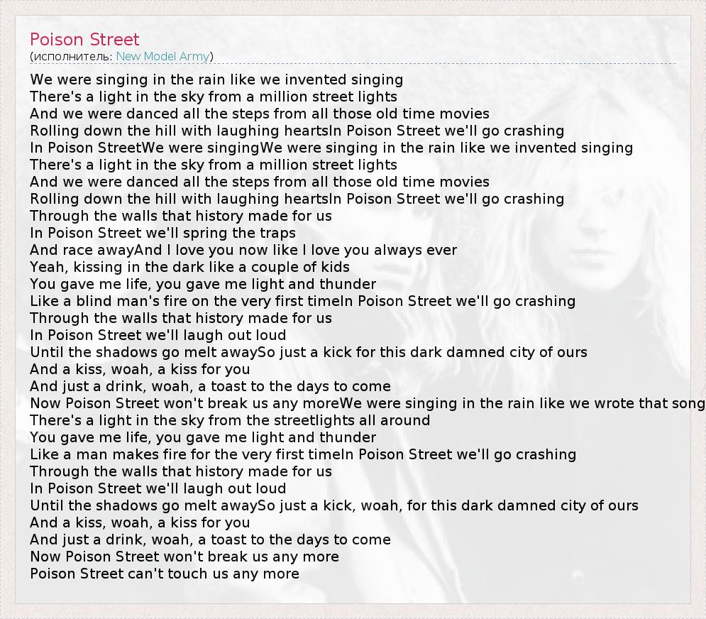 Now Poison Street won't break us any moreWe were singing in the rain like we wrote that song