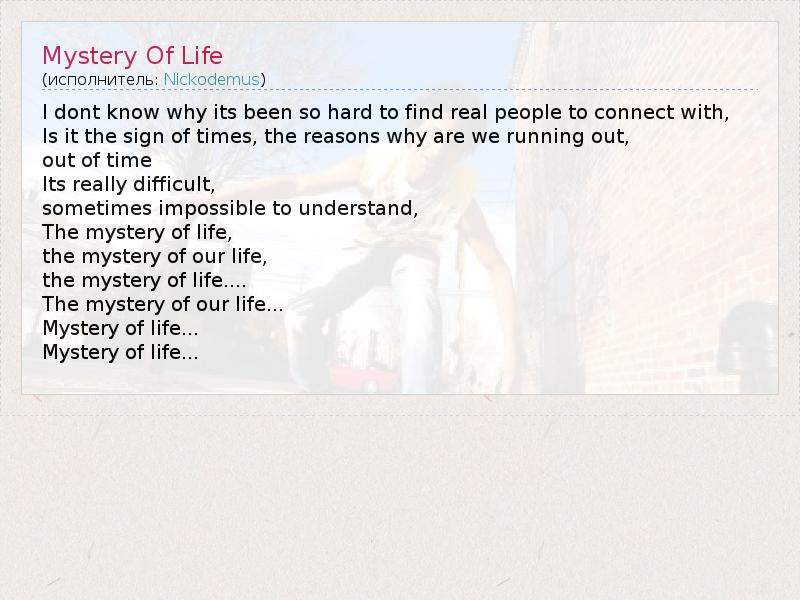 I dont know why its been so hard to find real people to connect with, Is it the sign of times, the reasons why are we running out, out of time Its really difficult, sometimes impossible to understand, The mystery of life, the mystery of our life, the mystery of life.... The mystery of our life... Mystery of life... Mystery of life...
