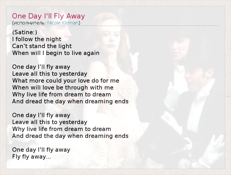 (Satine:) I follow the night Can't stand the light When will I begin to live again One day I'll fly away Leave all this to yesterday What more could your love do for me When will love be through with me Why live life from dream to dream And dread the day when dreaming ends One day I'll fly away Leave all this to yesterday Why live life from dream to dream And dread the day when dreaming ends One day I'll fly away Fly fly away...