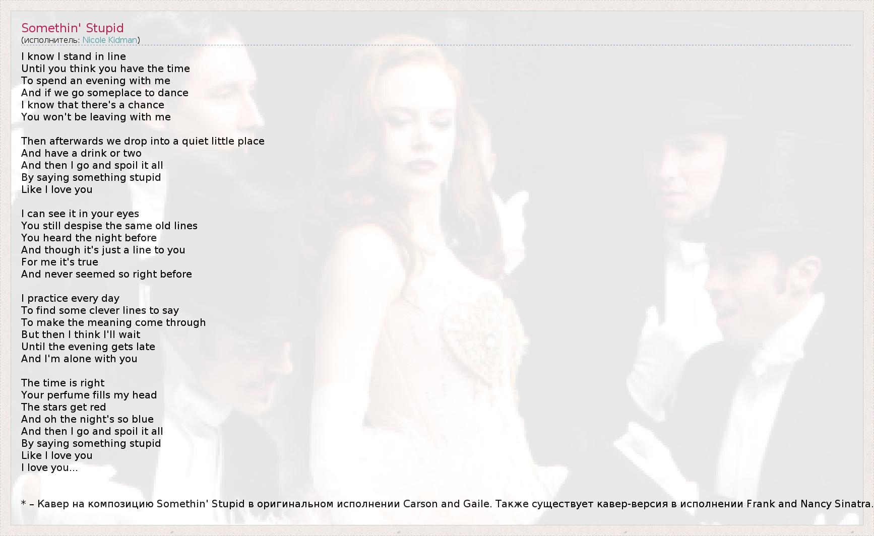 I know I stand in line Until you think you have the time To spend an evening with me And if we go someplace to dance I know that there's a chance You won't be leaving with me Then afterwards we drop into a quiet little place And have a drink or two And then I go and spoil it all By saying something stupid Like I love you I can see it in your eyes You still despise the same old lines You heard the night before And though it's just a line to you For me it's true And never seemed so right before I practice every day To find some clever lines to say To make the meaning come through But then I think I'll wait Until the evening gets late And I'm alone with you The time is right Your perfume fills my head The stars get red And oh the night's so blue And then I go and spoil it all By saying something stupid Like I love you I love you... * – Кавер на композицию Somethin' Stupid в оригинальном исполнении Carson and Gaile. Также существует кавер-версия в исполнении Frank and Nancy Sinatra.