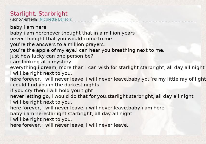 baby i am here baby i am herenever thought that in a million years never thought that you would come to me you're the answers to a million prayers. you're the apple of my eye.i can hear you breathing next to me. just how lucky can one person be? i am looking at a mystery everything i dream, more than i can wish for.starlight starbright, all day all night i will be right next to you. here forever, i will never leave, i will never leave.baby you're my little ray of light i could find you in the darkest nights if you cry then i will hold you tight never letting go, i would do that for you.starlight starbright, all day all night i will be right next to you. here forever, i will never leave, i will never leave.baby i am here baby i am herestarlight starbright, all day all night i will be right next to you. here forever, i will never leave, i will never leave.