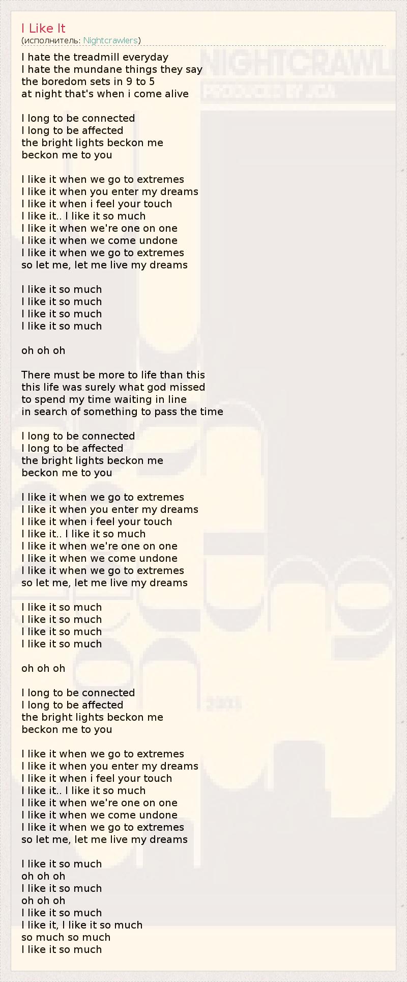 I hate the treadmill everyday I hate the mundane things they say the boredom sets in 9 to 5 at night that's when i come alive I long to be connected I long to be affected the bright lights beckon me beckon me to you I like it when we go to extremes I like it when you enter my dreams I like it when i feel your touch I like it.. I like it so much I like it when we're one on one I like it when we come undone I like it when we go to extremes so let me, let me live my dreams I like it so much I like it so much I like it so much I like it so much oh oh oh There must be more to life than this this life was surely what god missed to spend my time waiting in line in search of something to pass the time I long to be connected I long to be affected the bright lights beckon me beckon me to you I like it when we go to extremes I like it when you enter my dreams I like it when i feel your touch I like it.. I like it so much I like it when we're one on one I like it when we come undone I like it when we go to extremes so let me, let me live my dreams I like it so much I like it so much I like it so much I like it so much oh oh oh I long to be connected I long to be affected the bright lights beckon me beckon me to you I like it when we go to extremes I like it when you enter my dreams I like it when i feel your touch I like it.. I like it so much I like it when we're one on one I like it when we come undone I like it when we go to extremes so let me, let me live my dreams I like it so much oh oh oh I like it so much oh oh oh I like it so much I like it, I like it so much so much so much I like it so much