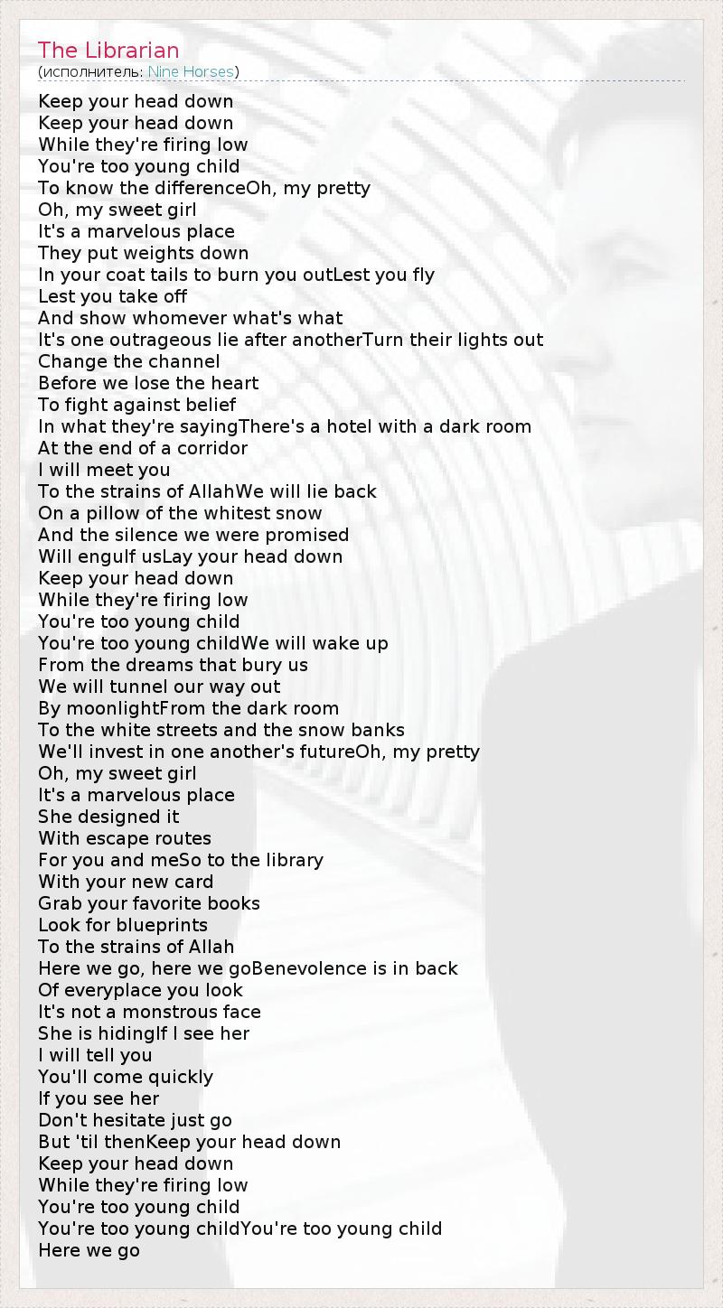 Keep your head down Keep your head down While they're firing low You're too young child To know the differenceOh, my pretty Oh, my sweet girl It's a marvelous place They put weights down In your coat tails to burn you outLest you fly Lest you take off And show whomever what's what It's one outrageous lie after anotherTurn their lights out Change the channel Before we lose the heart To fight against belief In what they're sayingThere's a hotel with a dark room At the end of a corridor I will meet you To the strains of AllahWe will lie back On a pillow of the whitest snow And the silence we were promised Will engulf usLay your head down Keep your head down While they're firing low You're too young child You're too young childWe will wake up From the dreams that bury us We will tunnel our way out By moonlightFrom the dark room To the white streets and the snow banks We'll invest in one another's futureOh, my pretty Oh, my sweet girl It's a marvelous place She designed it With escape routes For you and meSo to the library With your new card Grab your favorite books Look for blueprints To the strains of Allah Here we go, here we goBenevolence is in back Of everyplace you look It's not a monstrous face She is hidingIf I see her I will tell you You'll come quickly If you see her Don't hesitate just go But 'til thenKeep your head down Keep your head down While they're firing low You're too young child You're too young childYou're too young child Here we go