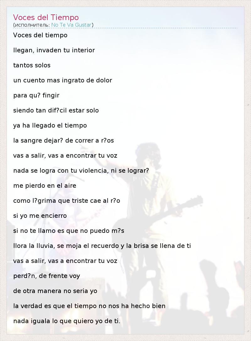 Voces del tiempo llegan, invaden tu interior tantos solos un cuento mas ingrato de dolor para qu? fingir siendo tan dif?cil estar solo ya ha llegado el tiempo la sangre dejar? de correr a r?os vas a salir, vas a encontrar tu voz nada se logra con tu violencia, ni se lograr? me pierdo en el aire como l?grima que triste cae al r?o si yo me encierro si no te llamo es que no puedo m?s llora la lluvia, se moja el recuerdo y la brisa se llena de ti vas a salir, vas a encontrar tu voz perd?n, de frente voy de otra manera no seria yo la verdad es que el tiempo no nos ha hecho bien nada iguala lo que quiero yo de ti.