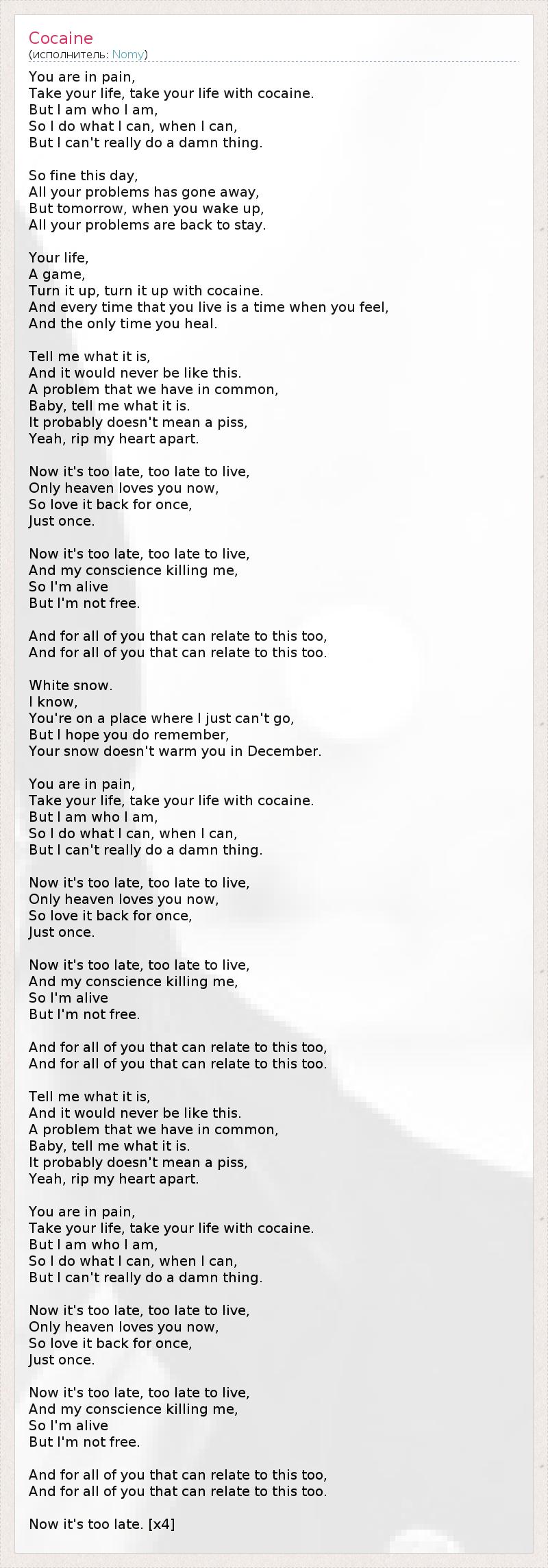 Тебе больно, Засыпь свою жизнь, засыпь свою жизнь кокаином. Но я тот, кто я есть, Так что буду делать, что могу и когда могу, Но не могу я ни черта. Сегодня так хорошо: Все твои проблемы исчезли, Но назавтра, когда ты проснёшься, Все они снова будут здесь. Твоя жизнь — Игра, Разгони её, разгони её кокаином. Всякий раз, когда ты живёшь на полную, ты ощущаешь, И только тогда ты исцеляешься. Скажи мне, каково это, И так больше никогда не будет. Проблема, общая для нас, Детка, скажи, что это. Может, это полная фигня, Да, разорви мне сердце. Сейчас слишком поздно, слишком поздно жить, Теперь одни небеса любят тебя, Полюби их в ответ Хоть раз. Сейчас слишком поздно, слишком поздно жить, И моя совесть убивает меня, Так что я жив, Но не свободен. И всё, связанное с тобой, тоже имеет к этому отношение, И всё, связанное с тобой, тоже имеет к этому отношение. Белый снег, Знаю, Ты там, куда мне не добраться, Но, надеюсь, ты помнишь, Что твой "снег" не согреет тебя в декабре. Тебе больно, Засыпь свою жизнь, засыпь свою жизнь кокаином. Но я тот, кто я есть, Так что буду делать, что могу и когда могу, Но не могу я ни черта. Сейчас слишком поздно, слишком поздно жить, Теперь одни небеса любят тебя, Полюби их в ответ Хоть раз. Сейчас слишком поздно, слишком поздно жить, И моя совесть убивает меня, Так что я жив, Но не свободен. И всё, связанное с тобой, тоже имеет к этому отношение, И всё, связанное с тобой, тоже имеет к этому отношение. Скажи мне, каково это, И так больше никогда не будет. Проблема, общая для нас, Детка, скажи, что это. Может, это полная фигня, Да, разорви мне сердце. Тебе больно, Засыпь свою жизнь, засыпь свою жизнь кокаином. Но я тот, кто я есть, Так что буду делать, что могу и когда могу, Но не могу я ни черта. Сейчас слишком поздно, слишком поздно жить, Теперь одни небеса любят тебя, Полюби их в ответ Хоть раз. Сейчас слишком поздно, слишком поздно жить, И моя совесть убивает меня, Так что я жив, Но не свободен. И всё, связанное с тобой, тоже имеет к этому отношение, И всё, связанное с тобой, тоже имеет к этому отношение. Теперь уже слишком поздно. [х4]