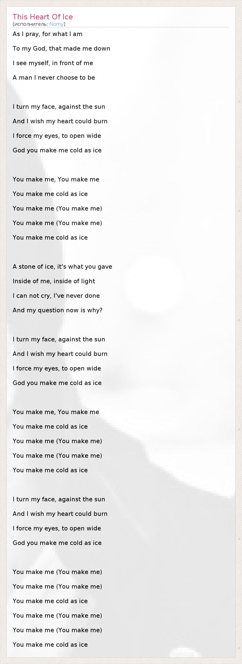 As I pray, for what I am To my God, that made me down I see myself, in front of me A man I never choose to be I turn my face, against the sun And I wish my heart could burn I force my eyes, to open wide God you make me cold as ice You make me, You make me You make me cold as ice You make me (You make me) You make me (You make me) You make me cold as ice A stone of ice, it's what you gave Inside of me, inside of light I can not cry, I've never done And my question now is why? I turn my face, against the sun And I wish my heart could burn I force my eyes, to open wide God you make me cold as ice You make me, You make me You make me cold as ice You make me (You make me) You make me (You make me) You make me cold as ice I turn my face, against the sun And I wish my heart could burn I force my eyes, to open wide God you make me cold as ice You make me (You make me) You make me (You make me) You make me cold as ice You make me (You make me) You make me (You make me) You make me cold as ice