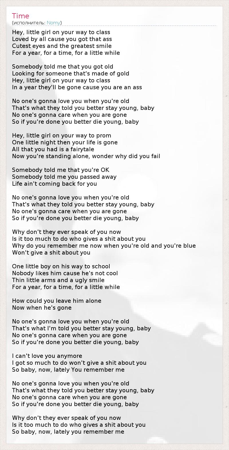 Хей, пока эта девочка шла к своему классу, Она успела понравиться всем парням, ведь у неё классная задница, Милейшие глазки и улыбка до ушей, И они будут такими год, до поры - до времени. Кто-то сказал мне, что ты постарела, Ожидая принца на белом коне. Хей, девочка на пути к классу, Но за год все отвернулись от тебя, ведь ты - стерва. Никто тебя не полюбит, когда ты постареешь, Именно поэтому тебе желают всегда оставаться молодой и красивой. Всем будет наплевать, когда ты уйдёшь из жизни, Так что если ты уже стареешь, то лучше умри молодой, детка! Хей, девочка пошла на выпускной. Всего одна короткая ночь, и твоя жизнь закончится. Всё, что у тебя было - это красивая сказка, И вот теперь ты стоишь в одиночестве, удивляясь, почему же всё так плохо. Кто-то говорит, что ты в порядке, Кто-то говорит, что ты отправилась на тот свет. Жизнь больше не будет прежней... Никто тебя не полюбит, когда ты постареешь, Именно поэтому тебе желают всегда оставаться молодой и красивой. Всем будет наплевать, когда ты уйдёшь из жизни, Так что если ты уже стареешь, то лучше умри молодой, детка! Почему же никто больше о тебе не говорит? Неужели людям, которым ты была небезразлична, так сложно вспомнить о тебе? Почему же ты вспоминаешь мои слова только тогда, когда постарела и поседела, Когда уже всем на тебя наплевать? Один парень направляется в школу. Никто его не любит, ведь он не крутой: Тонкие крохотные руки и отвратительная улыбка, И они будут такими год, до поры - до времени. Как ты могла бросить его? Теперь, когда он умирает... Никто тебя не полюбит, когда ты постареешь, Именно поэтому тебе желают всегда оставаться молодой и красивой. Всем будет наплевать, когда ты уйдёшь из жизни, Так что если ты уже стареешь, то лучше умри молодой, детка! Я больше не могу любить тебя, Я сделал всё, чтобы забыть про тебя. Но, детка, сейчас или потом, ты вспомнишь обо мне... Никто тебя не полюбит, когда ты постареешь, Именно поэтому тебе желают всегда оставаться молодой и красивой. Всем будет наплевать, когда ты уйдёшь из жизни, Так что если ты уже стареешь, то лучше умри молодой, детка! Почему же никто больше о тебе не говорит? Неужели людям, которые любили тебя, так трудно вспомнить о тебе? Так что, детка, сейчас или потом, ты вспомнишь обо мне...