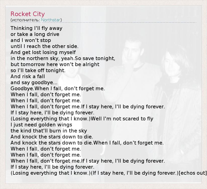 Thinking I'll fly away or take a long drive and I won't stop until I reach the other side. And get lost losing myself in the northern sky, yeah.So save tonight, but tomorrow here won't be alright so I'll take off tonight. And risk a fall and say goodbye... Goodbye.When I fall, don't forget me. When I fall, don't forget me. When I fall, don't forget me. When I fall, don't forget me.If I stay here, I'll be dying forever. If I stay here, I'll be dying forever. (Losing everything that I know.)Well I'm not scared to fly I just need golden wings the kind that'll burn in the sky And knock the stars down to die. And knock the stars down to die.When I fall, don't forget me. When I fall, don't forget me. When I fall, don't forget me. When I fall, don't forget me.If I stay here, I'll be dying forever. If I stay here, I'll be dying forever. (Losing everything that I know.)(If I stay here, I'll be dying forever.)[echos out]