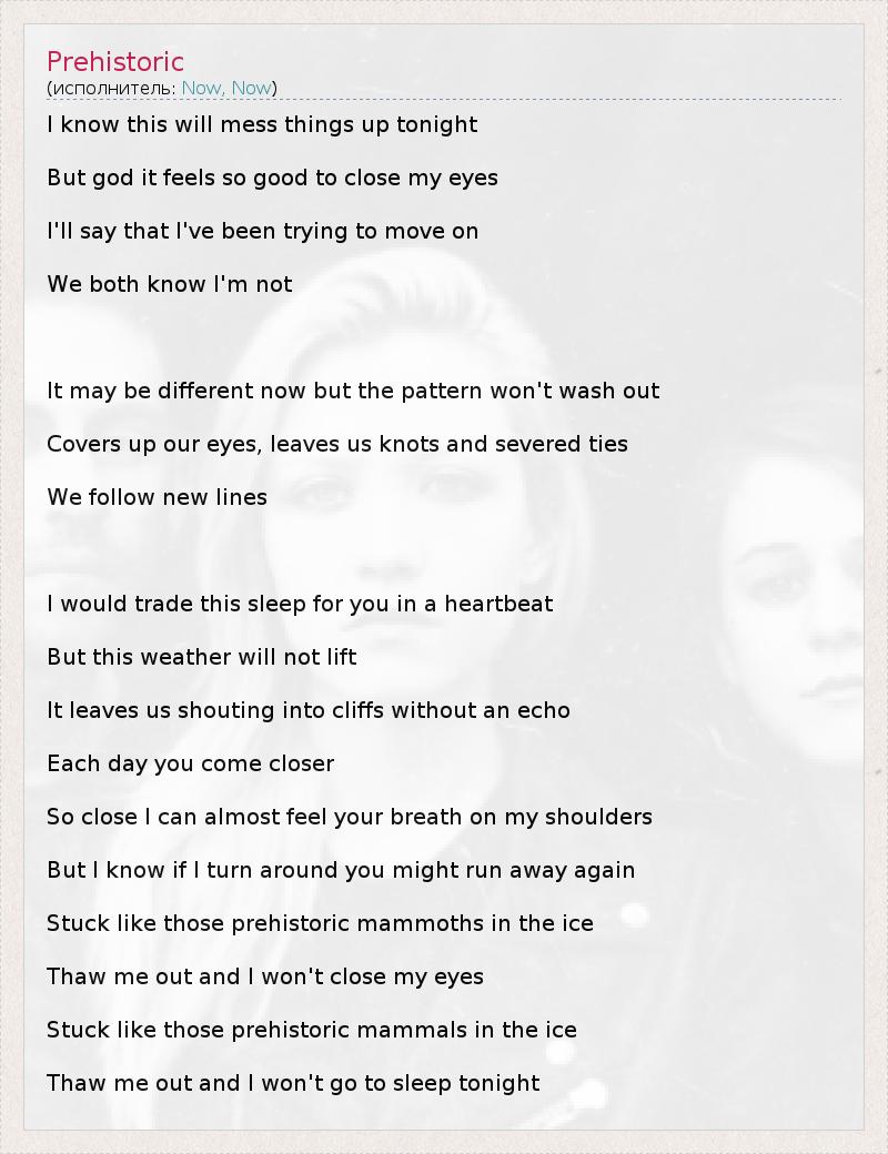 I know this will mess things up tonight But god it feels so good to close my eyes I'll say that I've been trying to move on We both know I'm not It may be different now but the pattern won't wash out Covers up our eyes, leaves us knots and severed ties We follow new lines I would trade this sleep for you in a heartbeat But this weather will not lift It leaves us shouting into cliffs without an echo Each day you come closer So close I can almost feel your breath on my shoulders But I know if I turn around you might run away again Stuck like those prehistoric mammoths in the ice Thaw me out and I won't close my eyes Stuck like those prehistoric mammals in the ice Thaw me out and I won't go to sleep tonight