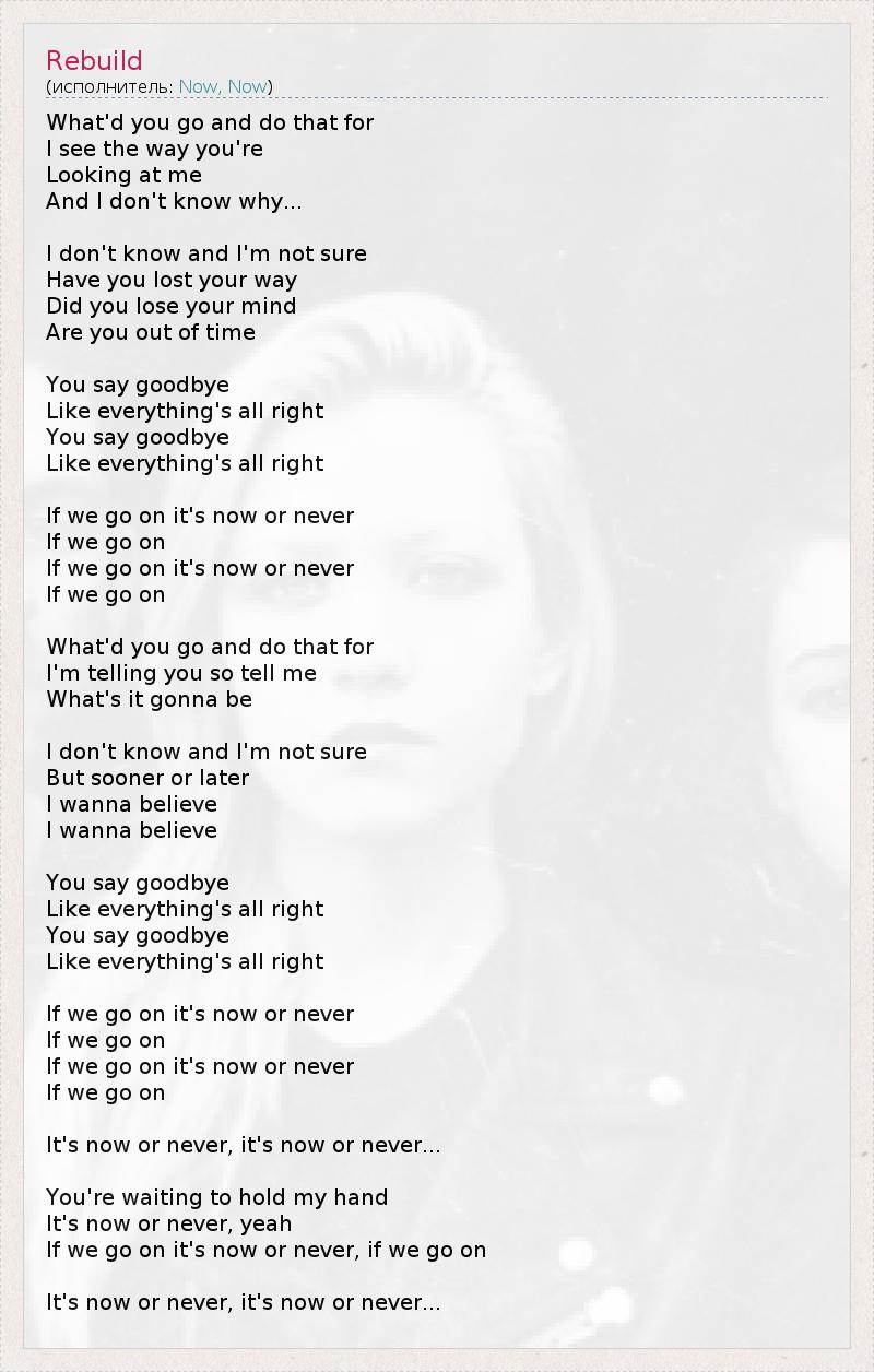 What'd you go and do that for I see the way you're Looking at me And I don't know why... I don't know and I'm not sure Have you lost your way Did you lose your mind Are you out of time You say goodbye Like everything's all right You say goodbye Like everything's all right If we go on it's now or never If we go on If we go on it's now or never If we go on What'd you go and do that for I'm telling you so tell me What's it gonna be I don't know and I'm not sure But sooner or later I wanna believe I wanna believe You say goodbye Like everything's all right You say goodbye Like everything's all right If we go on it's now or never If we go on If we go on it's now or never If we go on It's now or never, it's now or never... You're waiting to hold my hand It's now or never, yeah If we go on it's now or never, if we go on It's now or never, it's now or never...