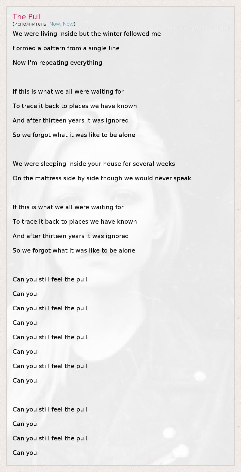 We were living inside but the winter followed me Formed a pattern from a single line Now I'm repeating everything If this is what we all were waiting for To trace it back to places we have known And after thirteen years it was ignored So we forgot what it was like to be alone We were sleeping inside your house for several weeks On the mattress side by side though we would never speak If this is what we all were waiting for To trace it back to places we have known And after thirteen years it was ignored So we forgot what it was like to be alone Can you still feel the pull Can you Can you still feel the pull Can you Can you still feel the pull Can you Can you still feel the pull Can you Can you still feel the pull Can you Can you still feel the pull Can you