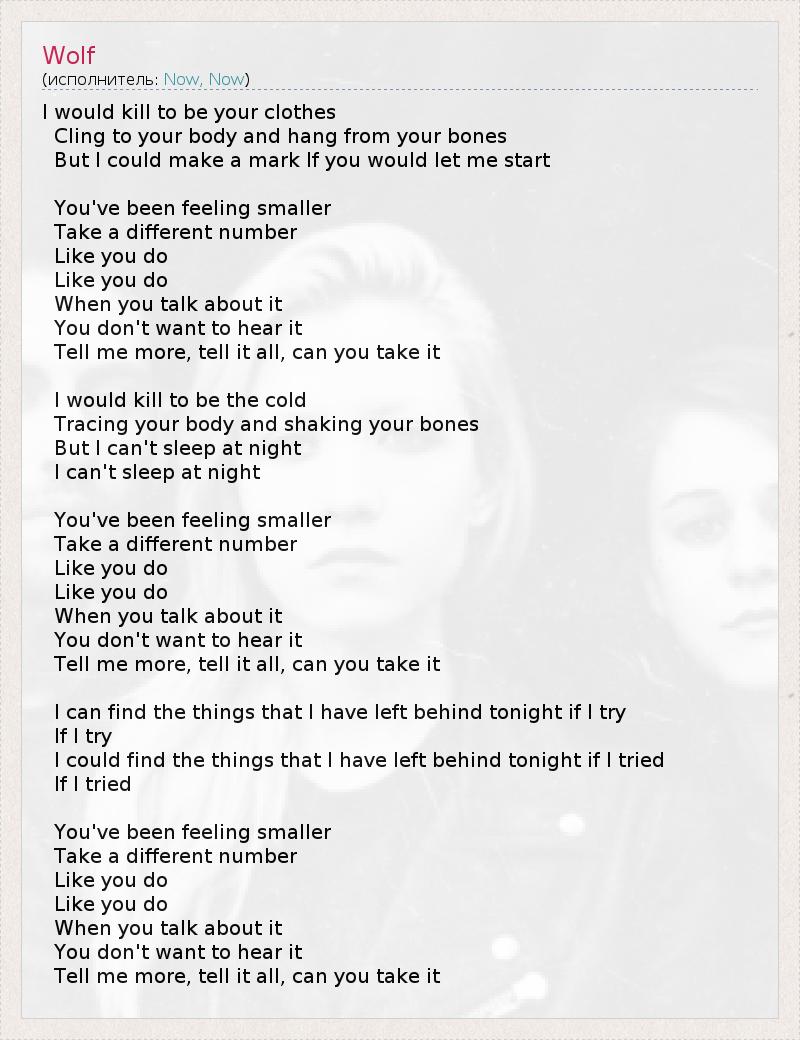 I would kill to be your clothes Cling to your body and hang from your bones But I could make a mark If you would let me start You've been feeling smaller Take a different number Like you do Like you do When you talk about it You don't want to hear it Tell me more, tell it all, can you take it I would kill to be the cold Tracing your body and shaking your bones But I can't sleep at night I can't sleep at night You've been feeling smaller Take a different number Like you do Like you do When you talk about it You don't want to hear it Tell me more, tell it all, can you take it I can find the things that I have left behind tonight if I try If I try I could find the things that I have left behind tonight if I tried If I tried You've been feeling smaller Take a different number Like you do Like you do When you talk about it You don't want to hear it Tell me more, tell it all, can you take it