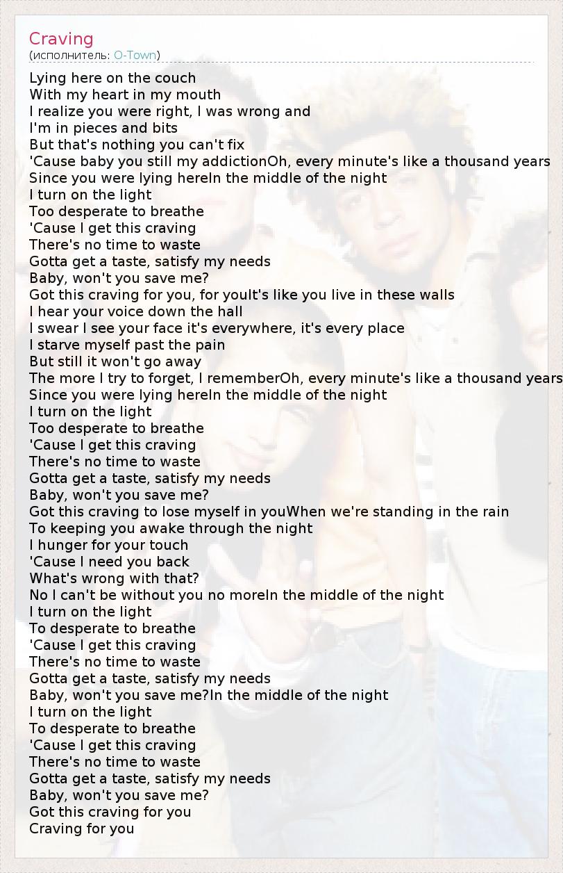 Lying here on the couch With my heart in my mouth I realize you were right, I was wrong and I'm in pieces and bits But that's nothing you can't fix 'Cause baby you still my addictionOh, every minute's like a thousand years Since you were lying hereIn the middle of the night I turn on the light Too desperate to breathe 'Cause I get this craving There's no time to waste Gotta get a taste, satisfy my needs Baby, won't you save me? Got this craving for you, for youIt's like you live in these walls I hear your voice down the hall I swear I see your face it's everywhere, it's every place I starve myself past the pain But still it won't go away The more I try to forget, I rememberOh, every minute's like a thousand years Since you were lying hereIn the middle of the night I turn on the light Too desperate to breathe 'Cause I get this craving There's no time to waste Gotta get a taste, satisfy my needs Baby, won't you save me? Got this craving to lose myself in youWhen we're standing in the rain To keeping you awake through the night I hunger for your touch 'Cause I need you back What's wrong with that? No I can't be without you no moreIn the middle of the night I turn on the light To desperate to breathe 'Cause I get this craving There's no time to waste Gotta get a taste, satisfy my needs Baby, won't you save me?In the middle of the night I turn on the light To desperate to breathe 'Cause I get this craving There's no time to waste Gotta get a taste, satisfy my needs Baby, won't you save me? Got this craving for you Craving for you