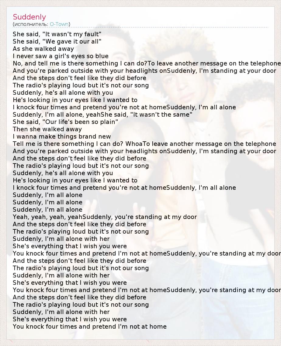 She said, "It wasn't my fault" She said, "We gave it our all" As she walked away I never saw a girl's eyes so blue No, and tell me is there something I can do?To leave another message on the telephone And you're parked outside with your headlights onSuddenly, I'm standing at your door And the steps don't feel like they did before The radio's playing loud but it's not our song Suddenly, he's all alone with you He's looking in your eyes like I wanted to I knock four times and pretend you're not at homeSuddenly, I'm all alone Suddenly, I'm all alone, yeahShe said, "It wasn't the same" She said, "Our life's been so plain" Then she walked away I wanna make things brand new Tell me is there something I can do? WhoaTo leave another message on the telephone And you're parked outside with your headlights onSuddenly, I'm standing at your door And the steps don't feel like they did before The radio's playing loud but it's not our song Suddenly, he's all alone with you He's looking in your eyes like I wanted to I knock four times and pretend you're not at homeSuddenly, I'm all alone Suddenly, I'm all alone Suddenly, I'm all alone Suddenly, I'm all alone Yeah, yeah, yeah, yeahSuddenly, you're standing at my door And the steps don't feel like they did before The radio's playing loud but it's not our song Suddenly, I'm all alone with her She's everything that I wish you were You knock four times and pretend I'm not at homeSuddenly, you're standing at my door And the steps don't feel like they did before The radio's playing loud but it's not our song Suddenly, I'm all alone with her She's everything that I wish you were You knock four times and pretend I'm not at homeSuddenly, you're standing at my door And the steps don't feel like they did before The radio's playing loud but it's not our song Suddenly, I'm all alone with her She's everything that I wish you were You knock four times and pretend I'm not at home