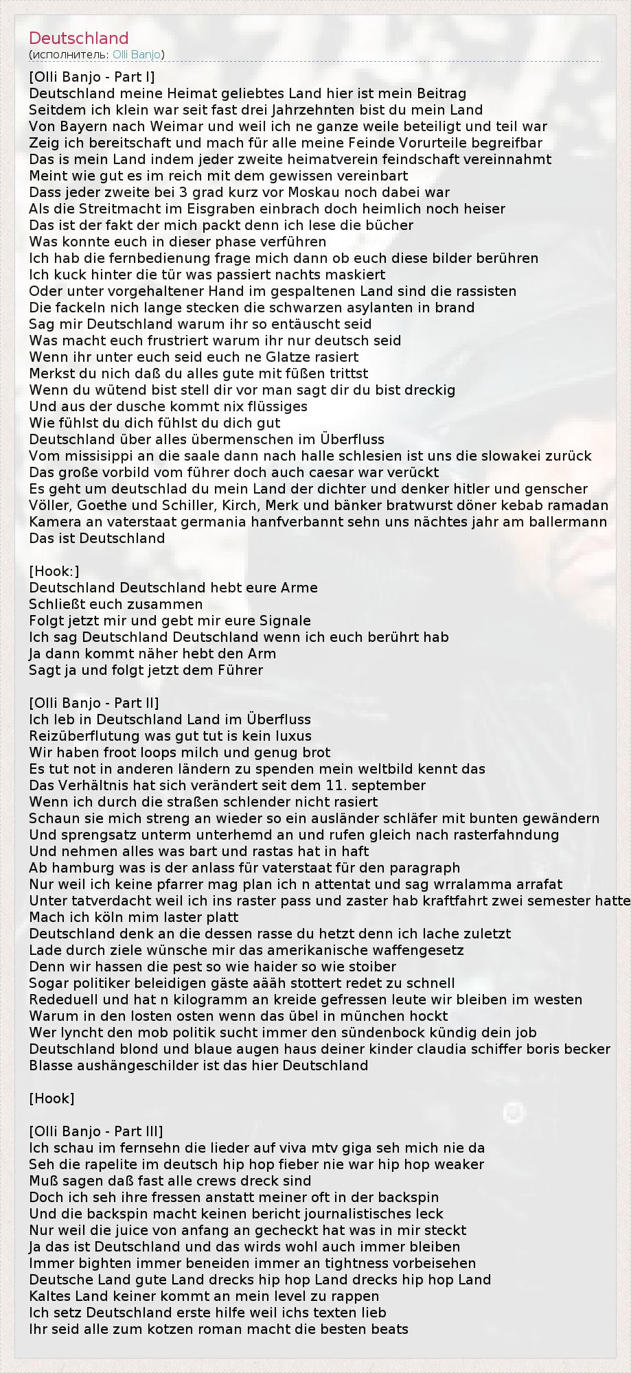 [Olli Banjo - Part I] Deutschland meine Heimat geliebtes Land hier ist mein Beitrag Seitdem ich klein war seit fast drei Jahrzehnten bist du mein Land Von Bayern nach Weimar und weil ich ne ganze weile beteiligt und teil war Zeig ich bereitschaft und mach für alle meine Feinde Vorurteile begreifbar Das is mein Land indem jeder zweite heimatverein feindschaft vereinnahmt Meint wie gut es im reich mit dem gewissen vereinbart Dass jeder zweite bei 3 grad kurz vor Moskau noch dabei war Als die Streitmacht im Eisgraben einbrach doch heimlich noch heiser Das ist der fakt der mich packt denn ich lese die bücher Was konnte euch in dieser phase verführen Ich hab die fernbedienung frage mich dann ob euch diese bilder berühren Ich kuck hinter die tür was passiert nachts maskiert Oder unter vorgehaltener Hand im gespaltenen Land sind die rassisten Die fackeln nich lange stecken die schwarzen asylanten in brand Sag mir Deutschland warum ihr so entäuscht seid Was macht euch frustriert warum ihr nur deutsch seid Wenn ihr unter euch seid euch ne Glatze rasiert Merkst du nich daß du alles gute mit füßen trittst Wenn du wütend bist stell dir vor man sagt dir du bist dreckig Und aus der dusche kommt nix flüssiges Wie fühlst du dich fühlst du dich gut Deutschland über alles übermenschen im Überfluss Vom missisippi an die saale dann nach halle schlesien ist uns die slowakei zurück Das große vorbild vom führer doch auch caesar war verückt Es geht um deutschlad du mein Land der dichter und denker hitler und genscher Völler, Goethe und Schiller, Kirch, Merk und bänker bratwurst döner kebab ramadan Kamera an vaterstaat germania hanfverbannt sehn uns nächtes jahr am ballermann Das ist Deutschland [Hook:] Deutschland Deutschland hebt eure Arme Schließt euch zusammen Folgt jetzt mir und gebt mir eure Signale Ich sag Deutschland Deutschland wenn ich euch berührt hab Ja dann kommt näher hebt den Arm Sagt ja und folgt jetzt dem Führer [Olli Banjo - Part II] Ich leb in Deutschland Land im Überfluss Reizüberflutung was gut tut is kein luxus Wir haben froot loops milch und genug brot Es tut not in anderen ländern zu spenden mein weltbild kennt das Das Verhältnis hat sich verändert seit dem 11. september Wenn ich durch die straßen schlender nicht rasiert Schaun sie mich streng an wieder so ein ausländer schläfer mit bunten gewändern Und sprengsatz unterm unterhemd an und rufen gleich nach rasterfahndung Und nehmen alles was bart und rastas hat in haft Ab hamburg was is der anlass für vaterstaat für den paragraph Nur weil ich keine pfarrer mag plan ich n attentat und sag wrralamma arrafat Unter tatverdacht weil ich ins raster pass und zaster hab kraftfahrt zwei semester hatte Mach ich köln mim laster platt Deutschland denk an die dessen rasse du hetzt denn ich lache zuletzt Lade durch ziele wünsche mir das amerikanische waffengesetz Denn wir hassen die pest so wie haider so wie stoiber Sogar politiker beleidigen gäste aääh stottert redet zu schnell Rededuell und hat n kilogramm an kreide gefressen leute wir bleiben im westen Warum in den losten osten wenn das übel in münchen hockt Wer lyncht den mob politik sucht immer den sündenbock kündig dein job Deutschland blond und blaue augen haus deiner kinder claudia schiffer boris becker Blasse aushängeschilder ist das hier Deutschland [Hook] [Olli Banjo - Part III] Ich schau im fernsehn die lieder auf viva mtv giga seh mich nie da Seh die rapelite im deutsch hip hop fieber nie war hip hop weaker Muß sagen daß fast alle crews dreck sind Doch ich seh ihre fressen anstatt meiner oft in der backspin Und die backspin macht keinen bericht journalistisches leck Nur weil die juice von anfang an gecheckt hat was in mir steckt Ja das ist Deutschland und das wirds wohl auch immer bleiben Immer bighten immer beneiden immer an tightness vorbeisehen Deutsche Land gute Land drecks hip hop Land drecks hip hop Land Kaltes Land keiner kommt an mein level zu rappen Ich setz Deutschland erste hilfe weil ichs texten lieb Ihr seid alle zum kotzen roman macht die besten beats