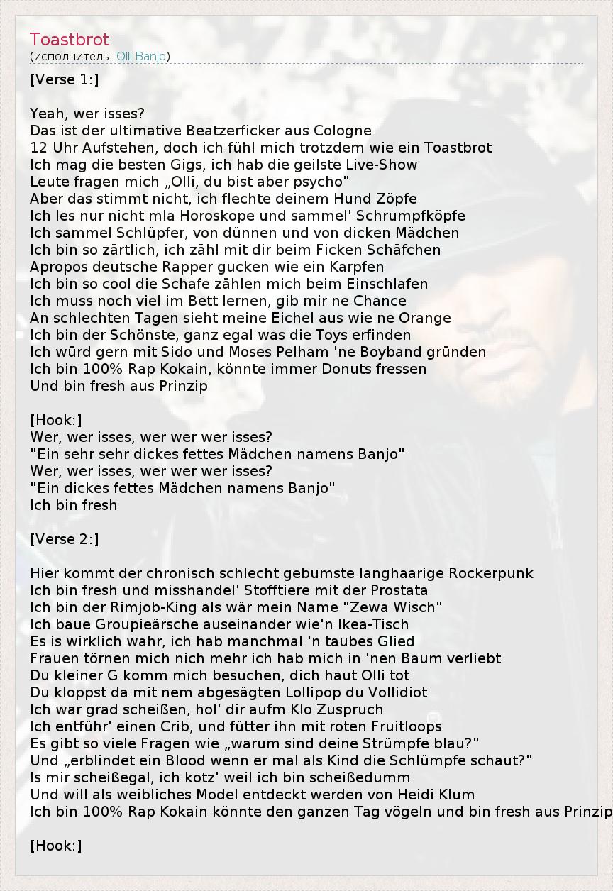 [Verse 1:] Yeah, wer isses? Das ist der ultimative Beatzerficker aus Cologne 12 Uhr Aufstehen, doch ich fühl mich trotzdem wie ein Toastbrot Ich mag die besten Gigs, ich hab die geilste Live-Show Leute fragen mich „Olli, du bist aber psycho" Aber das stimmt nicht, ich flechte deinem Hund Zöpfe Ich les nur nicht mla Horoskope und sammel' Schrumpfköpfe Ich sammel Schlüpfer, von dünnen und von dicken Mädchen Ich bin so zärtlich, ich zähl mit dir beim Ficken Schäfchen Apropos deutsche Rapper gucken wie ein Karpfen Ich bin so cool die Schafe zählen mich beim Einschlafen Ich muss noch viel im Bett lernen, gib mir ne Chance An schlechten Tagen sieht meine Eichel aus wie ne Orange Ich bin der Schönste, ganz egal was die Toys erfinden Ich würd gern mit Sido und Moses Pelham 'ne Boyband gründen Ich bin 100% Rap Kokain, könnte immer Donuts fressen Und bin fresh aus Prinzip [Hook:] Wer, wer isses, wer wer wer isses? "Ein sehr sehr dickes fettes Mädchen namens Banjo" Wer, wer isses, wer wer wer isses? "Ein dickes fettes Mädchen namens Banjo" Ich bin fresh [Verse 2:] Hier kommt der chronisch schlecht gebumste langhaarige Rockerpunk Ich bin fresh und misshandel' Stofftiere mit der Prostata Ich bin der Rimjob-King als wär mein Name "Zewa Wisch" Ich baue Groupieärsche auseinander wie'n Ikea-Tisch Es is wirklich wahr, ich hab manchmal 'n taubes Glied Frauen törnen mich nich mehr ich hab mich in 'nen Baum verliebt Du kleiner G komm mich besuchen, dich haut Olli tot Du kloppst da mit nem abgesägten Lollipop du Vollidiot Ich war grad scheißen, hol' dir aufm Klo Zuspruch Ich entführ' einen Crib, und fütter ihn mit roten Fruitloops Es gibt so viele Fragen wie „warum sind deine Strümpfe blau?" Und „erblindet ein Blood wenn er mal als Kind die Schlümpfe schaut?" Is mir scheißegal, ich kotz' weil ich bin scheißedumm Und will als weibliches Model entdeckt werden von Heidi Klum Ich bin 100% Rap Kokain könnte den ganzen Tag vögeln und bin fresh aus Prinzip [Hook:]