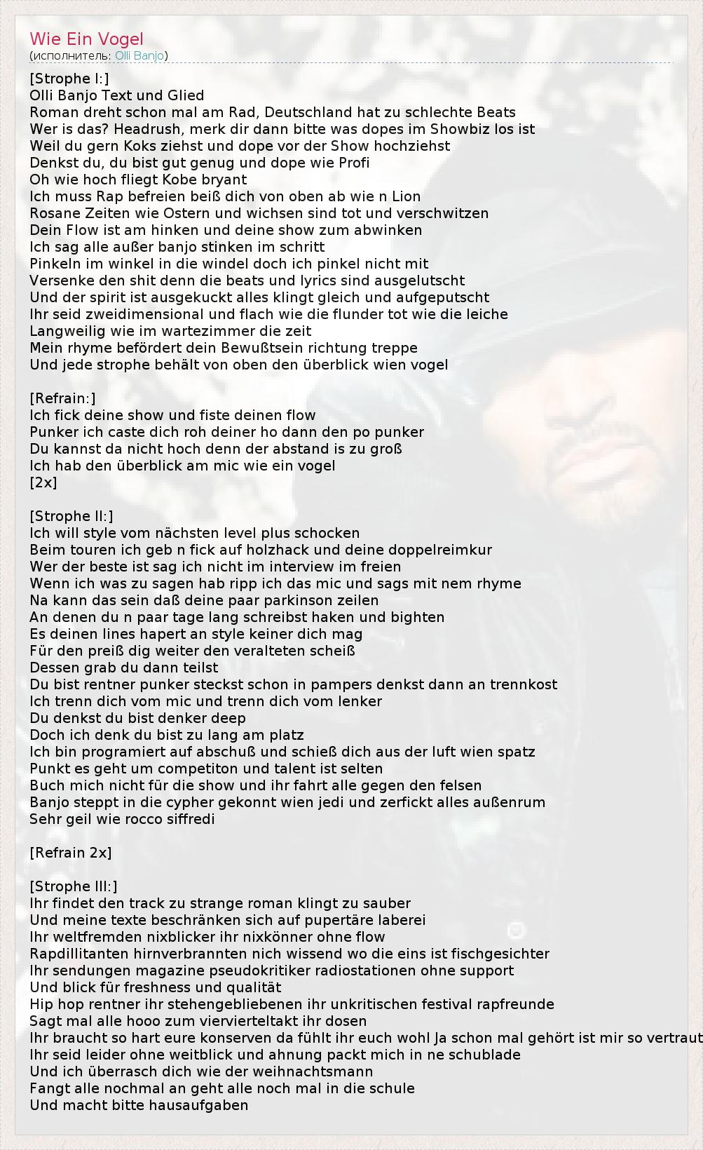 [Strophe I:] Olli Banjo Text und Glied Roman dreht schon mal am Rad, Deutschland hat zu schlechte Beats Wer is das? Headrush, merk dir dann bitte was dopes im Showbiz los ist Weil du gern Koks ziehst und dope vor der Show hochziehst Denkst du, du bist gut genug und dope wie Profi Oh wie hoch fliegt Kobe bryant Ich muss Rap befreien beiß dich von oben ab wie n Lion Rosane Zeiten wie Ostern und wichsen sind tot und verschwitzen Dein Flow ist am hinken und deine show zum abwinken Ich sag alle außer banjo stinken im schritt Pinkeln im winkel in die windel doch ich pinkel nicht mit Versenke den shit denn die beats und lyrics sind ausgelutscht Und der spirit ist ausgekuckt alles klingt gleich und aufgeputscht Ihr seid zweidimensional und flach wie die flunder tot wie die leiche Langweilig wie im wartezimmer die zeit Mein rhyme befördert dein Bewußtsein richtung treppe Und jede strophe behält von oben den überblick wien vogel [Refrain:] Ich fick deine show und fiste deinen flow Punker ich caste dich roh deiner ho dann den po punker Du kannst da nicht hoch denn der abstand is zu groß Ich hab den überblick am mic wie ein vogel [2x] [Strophe II:] Ich will style vom nächsten level plus schocken Beim touren ich geb n fick auf holzhack und deine doppelreimkur Wer der beste ist sag ich nicht im interview im freien Wenn ich was zu sagen hab ripp ich das mic und sags mit nem rhyme Na kann das sein daß deine paar parkinson zeilen An denen du n paar tage lang schreibst haken und bighten Es deinen lines hapert an style keiner dich mag Für den preiß dig weiter den veralteten scheiß Dessen grab du dann teilst Du bist rentner punker steckst schon in pampers denkst dann an trennkost Ich trenn dich vom mic und trenn dich vom lenker Du denkst du bist denker deep Doch ich denk du bist zu lang am platz Ich bin programiert auf abschuß und schieß dich aus der luft wien spatz Punkt es geht um competiton und talent ist selten Buch mich nicht für die show und ihr fahrt alle gegen den felsen Banjo steppt in die cypher gekonnt wien jedi und zerfickt alles außenrum Sehr geil wie rocco siffredi [Refrain 2x] [Strophe III:] Ihr findet den track zu strange roman klingt zu sauber Und meine texte beschränken sich auf pupertäre laberei Ihr weltfremden nixblicker ihr nixkönner ohne flow Rapdillitanten hirnverbrannten nich wissend wo die eins ist fischgesichter Ihr sendungen magazine pseudokritiker radiostationen ohne support Und blick für freshness und qualität Hip hop rentner ihr stehengebliebenen ihr unkritischen festival rapfreunde Sagt mal alle hooo zum viervierteltakt ihr dosen Ihr braucht so hart eure konserven da fühlt ihr euch wohl Ja schon mal gehört ist mir so vertraut Ihr seid leider ohne weitblick und ahnung packt mich in ne schublade Und ich überrasch dich wie der weihnachtsmann Fangt alle nochmal an geht alle noch mal in die schule Und macht bitte hausaufgaben