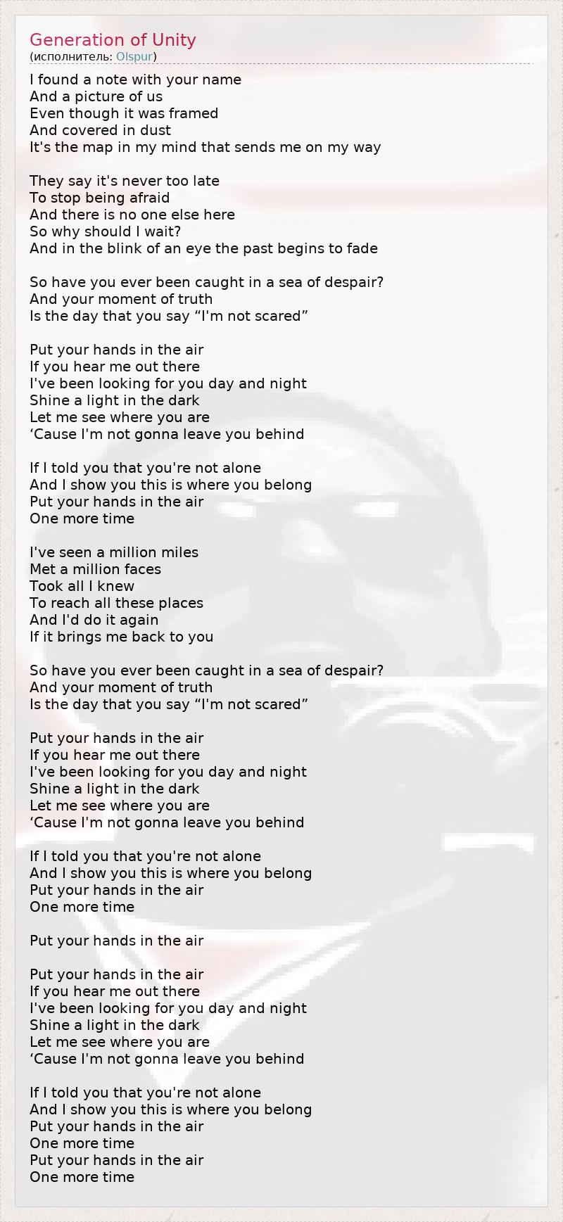 Я нашел записку с твоим именем И нашу с тобой фотографию. И пусть она была в рамке И покрыта пылью, Она карта, которая наставляет мои мысли на верный путь. Говорят, никогда не поздно Перестать бояться. И со мной нет никого рядом, Так зачем же ждать? И в мгновение ока прошлое начинает испаряться. Так попадал ли ты когда-нибудь в океан отчаянья? Твой момент истины — Это день, когда ты скажешь: "Я не боюсь" Подними руки вверх, Если ты, там, меня слышишь. Я искал тебя днями и ночами. Сверкни в темноте — Дай мне увидеть, где ты, Потому что я не собираюсь оставлять тебя одного. Если я сказал тебе, что ты не одинок, И показал тебе место, где тебе рады, Подними руки вверх Еще раз. Я прошел тысячи миль, Видел тысячи лиц, Собрал все свои знания, Чтобы добраться до всех этих мест. И я бы сделал это еще раз, Если бы это привело меня к тебе. Так попадал ли ты когда-нибудь в океан отчаянья? Твой момент истины — Это день, когда ты скажешь: "Я не боюсь" Подними руки вверх, Если ты, там, меня слышишь. Я искал тебя днями и ночами. Сверкни в темноте — Дай мне увидеть, где ты, Потому что я не собираюсь оставлять тебя одного. Если я сказал тебе, что ты не одинок, И показал тебе место, где тебе рады, Подними руки вверх Еще раз. Подними руки вверх. Подними руки вверх, Если ты, там, меня слышишь. Я искал тебя днями и ночами. Сверкни в темноте — Дай мне увидеть, где ты, Потому что я не собираюсь оставлять тебя одного. Если я сказал тебе, что ты не одинок, И показал тебе место, где тебе рады, Подними руки вверх Еще раз. Подними руки вверх Еще раз.