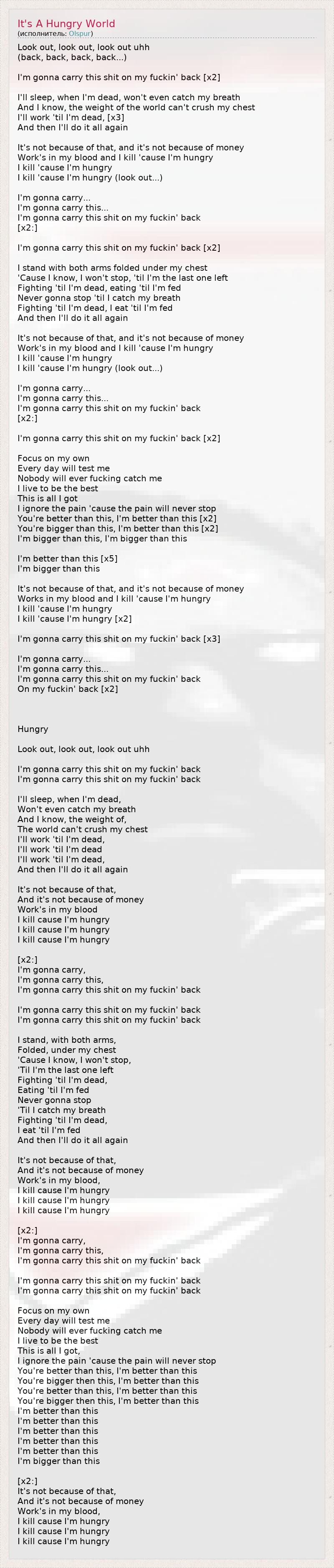 Look out, look out, look out uhh (back, back, back, back...) I'm gonna carry this shit on my fuckin' back [x2] I'll sleep, when I'm dead, won't even catch my breath And I know, the weight of the world can't crush my chest I'll work 'til I'm dead, [x3] And then I'll do it all again It's not because of that, and it's not because of money Work's in my blood and I kill 'cause I'm hungry I kill 'cause I'm hungry I kill 'cause I'm hungry (look out...) I'm gonna carry... I'm gonna carry this... I'm gonna carry this shit on my fuckin' back [x2:] I'm gonna carry this shit on my fuckin' back [x2] I stand with both arms folded under my chest 'Cause I know, I won't stop, 'til I'm the last one left Fighting 'til I'm dead, eating 'til I'm fed Never gonna stop 'til I catch my breath Fighting 'til I'm dead, I eat 'til I'm fed And then I'll do it all again It's not because of that, and it's not because of money Work's in my blood and I kill 'cause I'm hungry I kill 'cause I'm hungry I kill 'cause I'm hungry (look out...) I'm gonna carry... I'm gonna carry this... I'm gonna carry this shit on my fuckin' back [x2:] I'm gonna carry this shit on my fuckin' back [x2] Focus on my own Every day will test me Nobody will ever fucking catch me I live to be the best This is all I got I ignore the pain 'cause the pain will never stop You're better than this, I'm better than this [x2] You're bigger than this, I'm better than this [x2] I'm bigger than this, I'm bigger than this I'm better than this [x5] I'm bigger than this It's not because of that, and it's not because of money Works in my blood and I kill 'cause I'm hungry I kill 'cause I'm hungry I kill 'cause I'm hungry [x2] I'm gonna carry this shit on my fuckin' back [x3] I'm gonna carry... I'm gonna carry this... I'm gonna carry this shit on my fuckin' back On my fuckin' back [x2] Hungry Look out, look out, look out uhh I'm gonna carry this shit on my fuckin' back I'm gonna carry this shit on my fuckin' back I'll sleep, when I'm dead, Won't even catch my breath And I know, the weight of, The world can't crush my chest I'll work 'til I'm dead, I'll work 'til I'm dead I'll work 'til I'm dead, And then I'll do it all again It's not because of that, And it's not because of money Work's in my blood I kill cause I'm hungry I kill cause I'm hungry I kill cause I'm hungry [x2:] I'm gonna carry, I'm gonna carry this, I'm gonna carry this shit on my fuckin' back I'm gonna carry this shit on my fuckin' back I'm gonna carry this shit on my fuckin' back I stand, with both arms, Folded, under my chest 'Cause I know, I won't stop, 'Til I'm the last one left Fighting 'til I'm dead, Eating 'til I'm fed Never gonna stop 'Til I catch my breath Fighting 'til I'm dead, I eat 'til I'm fed And then I'll do it all again It's not because of that, And it's not because of money Work's in my blood, I kill cause I'm hungry I kill cause I'm hungry I kill cause I'm hungry [x2:] I'm gonna carry, I'm gonna carry this, I'm gonna carry this shit on my fuckin' back I'm gonna carry this shit on my fuckin' back I'm gonna carry this shit on my fuckin' back Focus on my own Every day will test me Nobody will ever fucking catch me I live to be the best This is all I got, I ignore the pain 'cause the pain will never stop You're better than this, I'm better than this You're bigger then this, I'm better than this You're better than this, I'm better than this You're bigger then this, I'm better than this I'm better than this I'm better than this I'm better than this I'm better than this I'm better than this I'm bigger than this [x2:] It's not because of that, And it's not because of money Work's in my blood, I kill cause I'm hungry I kill cause I'm hungry I kill cause I'm hungry