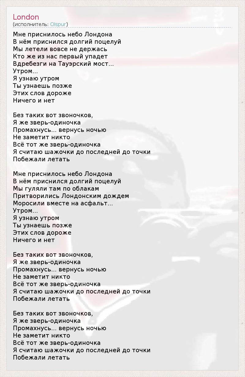 Мне приснилось небо Лондона В нём приснился долгий поцелуй Мы летели вовсе не держась Кто же из нас первый упадет Вдребезги на Тауэрский мост... Утром... Я узнаю утром Ты узнаешь позже Этих слов дороже Ничего и нет Без таких вот звоночков, Я же зверь-одиночка Промахнусь... вернусь ночью Не заметит никто Всё тот же зверь-одиночка Я считаю шажочки до последней до точки Побежали летать Мне приснилось небо Лондона В нём приснился долгий поцелуй Мы гуляли там по облакам Притворились Лондонским дождем Моросили вместе на асфальт... Утром... Я узнаю утром Ты узнаешь позже Этих слов дороже Ничего и нет Без таких вот звоночков, Я же зверь-одиночка Промахнусь... вернусь ночью Не заметит никто Всё тот же зверь-одиночка Я считаю шажочки до последней до точки Побежали летать Без таких вот звоночков, Я же зверь-одиночка Промахнусь... вернусь ночью Не заметит никто Всё тот же зверь-одиночка Я считаю шажочки до последней до точки Побежали летать