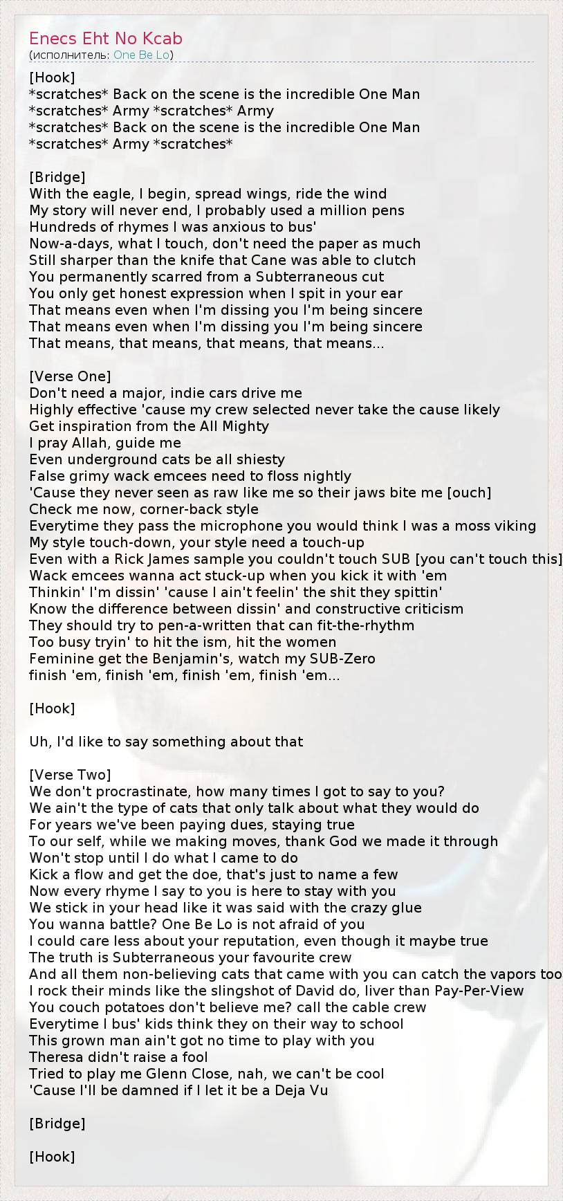 [Hook] *scratches* Back on the scene is the incredible One Man *scratches* Army *scratches* Army *scratches* Back on the scene is the incredible One Man *scratches* Army *scratches* [Bridge] With the eagle, I begin, spread wings, ride the wind My story will never end, I probably used a million pens Hundreds of rhymes I was anxious to bus' Now-a-days, what I touch, don't need the paper as much Still sharper than the knife that Cane was able to clutch You permanently scarred from a Subterraneous cut You only get honest expression when I spit in your ear That means even when I'm dissing you I'm being sincere That means even when I'm dissing you I'm being sincere That means, that means, that means, that means... [Verse One] Don't need a major, indie cars drive me Highly effective 'cause my crew selected never take the cause likely Get inspiration from the All Mighty I pray Allah, guide me Even underground cats be all shiesty False grimy wack emcees need to floss nightly 'Cause they never seen as raw like me so their jaws bite me [ouch] Check me now, corner-back style Everytime they pass the microphone you would think I was a moss viking My style touch-down, your style need a touch-up Even with a Rick James sample you couldn't touch SUB [you can't touch this] Wack emcees wanna act stuck-up when you kick it with 'em Thinkin' I'm dissin' 'cause I ain't feelin' the shit they spittin' Know the difference between dissin' and constructive criticism They should try to pen-a-written that can fit-the-rhythm Too busy tryin' to hit the ism, hit the women Feminine get the Benjamin's, watch my SUB-Zero finish 'em, finish 'em, finish 'em, finish 'em... [Hook] Uh, I'd like to say something about that [Verse Two] We don't procrastinate, how many times I got to say to you? We ain't the type of cats that only talk about what they would do For years we've been paying dues, staying true To our self, while we making moves, thank God we made it through Won't stop until I do what I came to do Kick a flow and get the doe, that's just to name a few Now every rhyme I say to you is here to stay with you We stick in your head like it was said with the crazy glue You wanna battle? One Be Lo is not afraid of you I could care less about your reputation, even though it maybe true The truth is Subterraneous your favourite crew And all them non-believing cats that came with you can catch the vapors too I rock their minds like the slingshot of David do, liver than Pay-Per-View You couch potatoes don't believe me? call the cable crew Everytime I bus' kids think they on their way to school This grown man ain't got no time to play with you Theresa didn't raise a fool Tried to play me Glenn Close, nah, we can't be cool 'Cause I'll be damned if I let it be a Deja Vu [Bridge] [Hook]