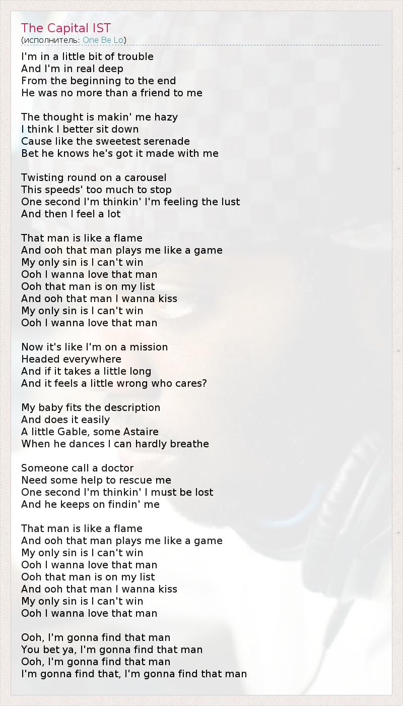 I'm in a little bit of trouble And I'm in real deep From the beginning to the end He was no more than a friend to me The thought is makin' me hazy I think I better sit down Cause like the sweetest serenade Bet he knows he's got it made with me Twisting round on a carousel This speeds' too much to stop One second I'm thinkin' I'm feeling the lust And then I feel a lot That man is like a flame And ooh that man plays me like a game My only sin is I can't win Ooh I wanna love that man Ooh that man is on my list And ooh that man I wanna kiss My only sin is I can't win Ooh I wanna love that man Now it's like I'm on a mission Headed everywhere And if it takes a little long And it feels a little wrong who cares? My baby fits the description And does it easily A little Gable, some Astaire When he dances I can hardly breathe Someone call a doctor Need some help to rescue me One second I'm thinkin' I must be lost And he keeps on findin' me That man is like a flame And ooh that man plays me like a game My only sin is I can't win Ooh I wanna love that man Ooh that man is on my list And ooh that man I wanna kiss My only sin is I can't win Ooh I wanna love that man Ooh, I'm gonna find that man You bet ya, I'm gonna find that man Ooh, I'm gonna find that man I'm gonna find that, I'm gonna find that man