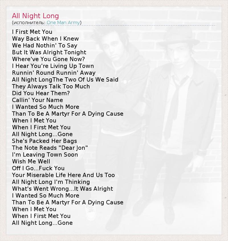 Это интересно:One Man Army - панк-рок группа, которая сформировалась в Сан-Франциско в 1996. Первая группа Джека Далримпла и Брэндона Поллака из Dead To Me. Дебютный альбом Dead End Stories был первым выпуском на Adeline Records, лейбле Билли Джо Армстронга.Долгое время циркулировавшие слухи о том, что не все в порядке с группой One Man Army оказались не просто слухами. В 2005 группа распалась. В последнее время участники OMA были заняты... продолжение