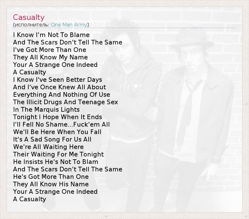 Это интересно:One Man Army - панк-рок группа, которая сформировалась в Сан-Франциско в 1996. Первая группа Джека Далримпла и Брэндона Поллака из Dead To Me. Дебютный альбом Dead End Stories был первым выпуском на Adeline Records, лейбле Билли Джо Армстронга.Долгое время циркулировавшие слухи о том, что не все в порядке с группой One Man Army оказались не просто слухами. В 2005 группа распалась. В последнее время участники OMA были заняты... продолжение