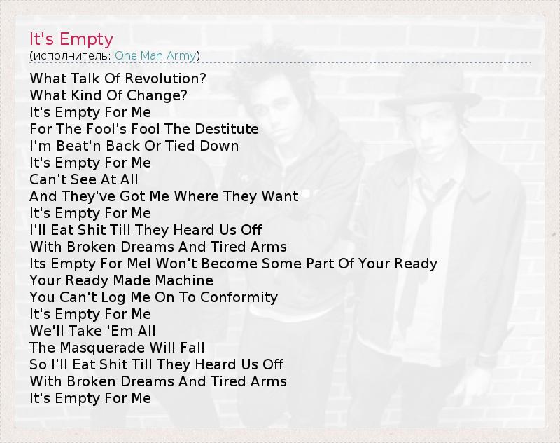 Это интересно:One Man Army - панк-рок группа, которая сформировалась в Сан-Франциско в 1996. Первая группа Джека Далримпла и Брэндона Поллака из Dead To Me. Дебютный альбом Dead End Stories был первым выпуском на Adeline Records, лейбле Билли Джо Армстронга.Долгое время циркулировавшие слухи о том, что не все в порядке с группой One Man Army оказались не просто слухами. В 2005 группа распалась. В последнее время участники OMA были заняты... продолжение
