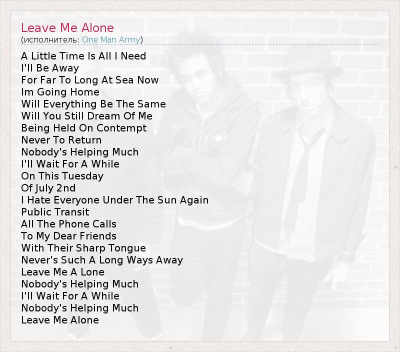 A Little Time Is All I Need I'll Be Away For Far To Long At Sea Now Im Going Home Will Everything Be The Same Will You Still Dream Of Me Being Held On Contempt Never To Return Nobody's Helping Much I'll Wait For A While On This Tuesday Of July 2nd I Hate Everyone Under The Sun Again Public Transit All The Phone Calls To My Dear Friends With Their Sharp Tongue Never's Such A Long Ways Away Leave Me A Lone Nobody's Helping Much I'll Wait For A While Nobody's Helping Much Leave Me Alone