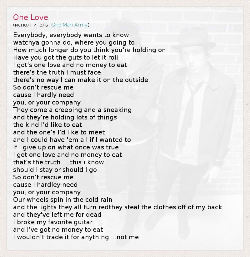 Это интересно:One Man Army - панк-рок группа, которая сформировалась в Сан-Франциско в 1996. Первая группа Джека Далримпла и Брэндона Поллака из Dead To Me. Дебютный альбом Dead End Stories был первым выпуском на Adeline Records, лейбле Билли Джо Армстронга.Долгое время циркулировавшие слухи о том, что не все в порядке с группой One Man Army оказались не просто слухами. В 2005 группа распалась. В последнее время участники OMA были заняты... продолжение