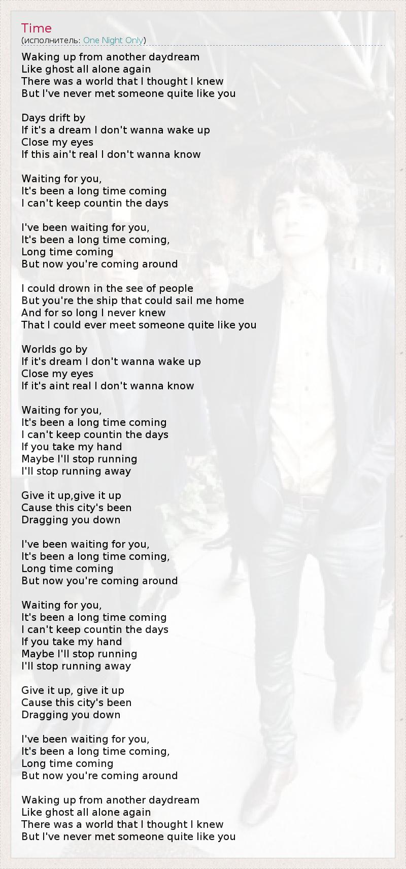 Проснувшись от очередной фантазии, Опять оказался совсем один, как призрак. Я думал, что знаю этот мир, Но я никогда не встречал кого-то похожего на тебя. Дни плывут по течению, Если это сон, я не хочу просыпаться. Закрываю глаза, Если это не реально, я не хочу знать об этом. Ожидание тебя Было таким долгим. Я не мог сосчитать дни. Я ждал тебя, И это длилось так долго. Так долго. Но теперь ты тут. Я мог утонуть в море людей, Но ты корабль, который мог доставить меня домой. И так долго, я даже представления не имел, Что могу встретить кого-то, как ты. Все идет своим чередом, Если это сон, я не хочу просыпаться. Закрываю глаза, Если это не реально, я не хочу знать об этом. Ожидание тебя Было таким долгим. Я не мог сосчитать дни. Если ты возьмешь меня за руку, Может, тогда я остановлюсь, Перестану убегать. Откажись от этого, откажись, Потому что этот город Тянул тебя вниз. Я ждал тебя, И это длилось так долго. Так долго. Но теперь ты тут. Ожидание тебя Было таким долгим. Я не мог сосчитать дни. Если ты возьмешь меня за руку, Может, тогда я остановлюсь, Перестану убегать. Откажись от этого, откажись, Потому что этот город Тянул тебя вниз. Я ждал тебя, И это длилось так долго. Так долго. Но теперь ты тут. Проснувшись от очередной фантазии, Опять оказался совсем один, как призрак. Я думал, что знаю этот мир, Но я никогда не встречал кого-то похожего на тебя.