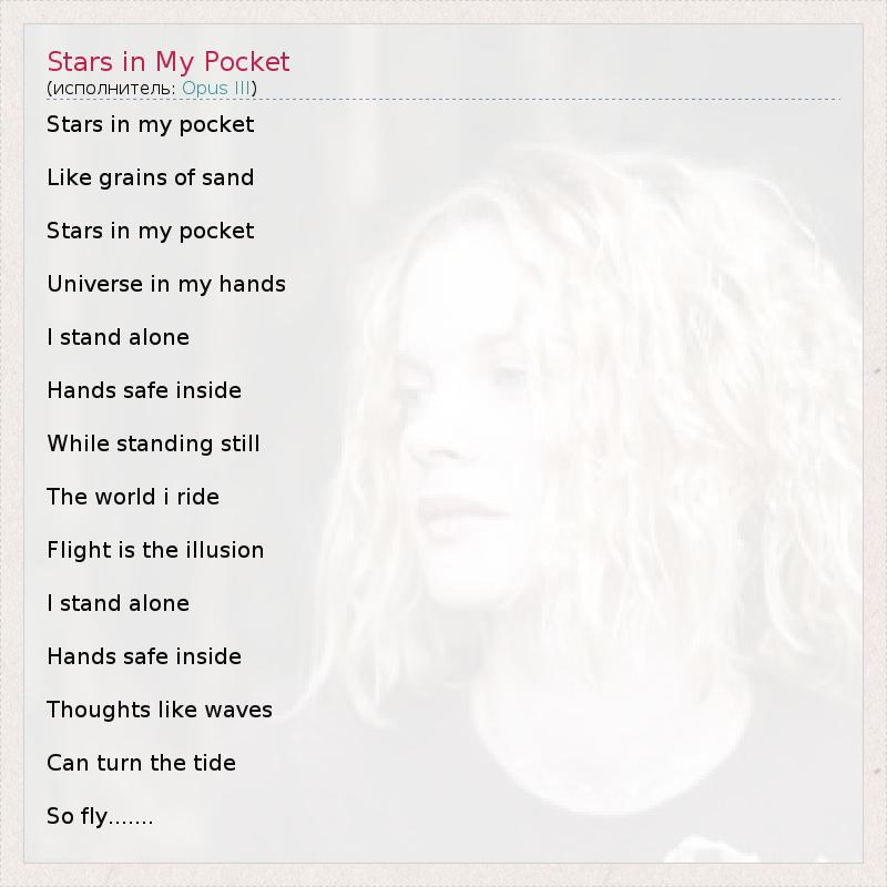 Stars in my pocket Like grains of sand Stars in my pocket Universe in my hands I stand alone Hands safe inside While standing still The world i ride Flight is the illusion I stand alone Hands safe inside Thoughts like waves Can turn the tide So fly.......