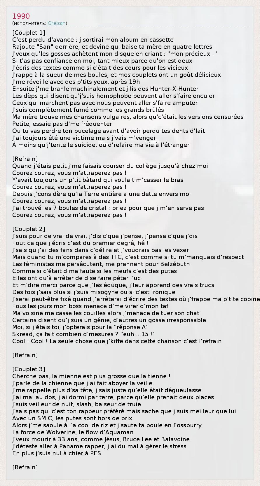 Это интересно:Orelsan, чье настоящее имя Аурелиан Cotentin, родился 1 августа 1982 года в Кане в кальвадос (Франция). Его родители учителя, и он должен следовать вывод, что исследования, получив степень бакалавра наук и несколько месяцев в школе управления. Вот как он будет удовлетворять Skread, производитель рэп-музыке. Этот доклад уже в культуре Orelsan в течение нескольких лет, и эта встреча станет дополнительным... продолжение
